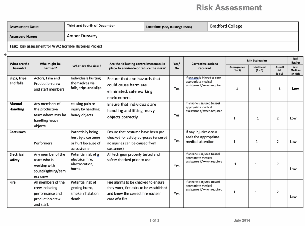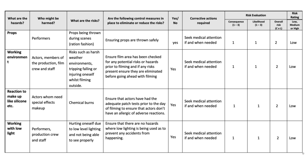 Below is my Risk assessment that I carried out to ensure the health and safety of all actors, production crew and staff members.