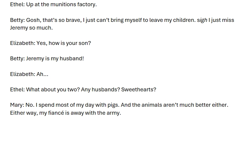 When we created the party scene it started off as us chucking ourselves into the scene and just improvising as we went. We used at least 2 lessons just being in the scene that we had set up whilst improvising, as we knew we would be creating a party scene. I used some of the research I had done surrounding Bradford during world war 2 to incorporate some real facts into the script being that ‘Hanson Lane’ was bombed and 11 people were sadly killed because of the bomb. I really enjoyed using this technique to create and devise this scene. Whilst creating backgrounds for each character in these scenes I decided to incorporate the different types of jobs that woman would have taken during the war due to men being away fighting in the war. These jobs included nurses, munition factory workers, farm hands and the mothers who stayed at home to look after there children.