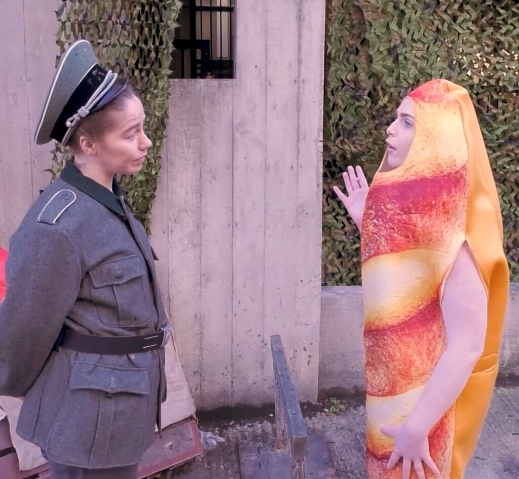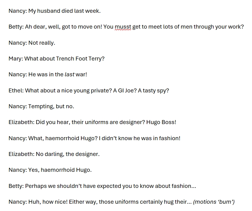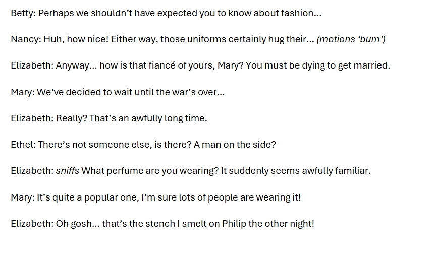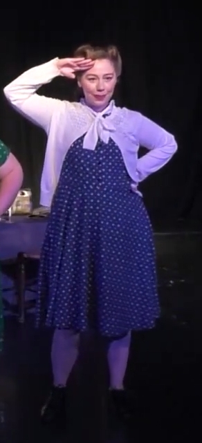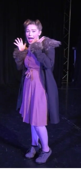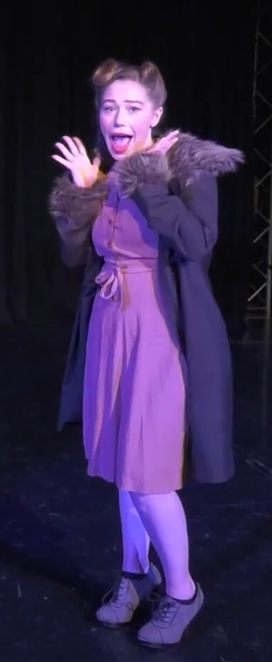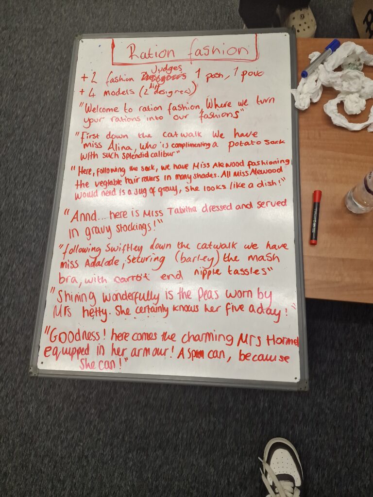 We created the idea if this scene whilst Joe the comedian came in and held a workshop with us, as a collective group and i really liked this idea. When we got the chance my self and another cast mate had a lot of creative freedom creating Ration Fashion with creative input from others. I really liked devising this scene and creating a witty, entertaining and exciting scene. I liked creating the characters of Diva Deborah and Sassy Silvia and how eccentric and flamboyant they both are. When we wrote the script for this we ensured to keep at least one real factual Fashion trend of the second world war being the gravy tights, before creating some wild out there Fashion trends surrounding the food for fashion idea.