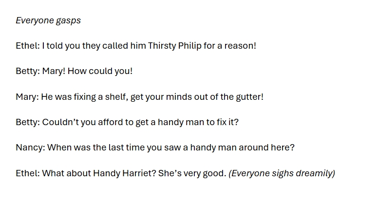 When we created the guard scene it was a collaborative work between us all, the idea was to play on the French border during the war and how stupid the German guards were and just let anyone through. How the french resistance continued to keep tricking them with the most silly excuses or lies as to why they needed to pass the border. I thought that this scene itself was very clever and the script made sense. I feel that this was also the easiest scene to write overall and was very easy to come up with the ideas for it.