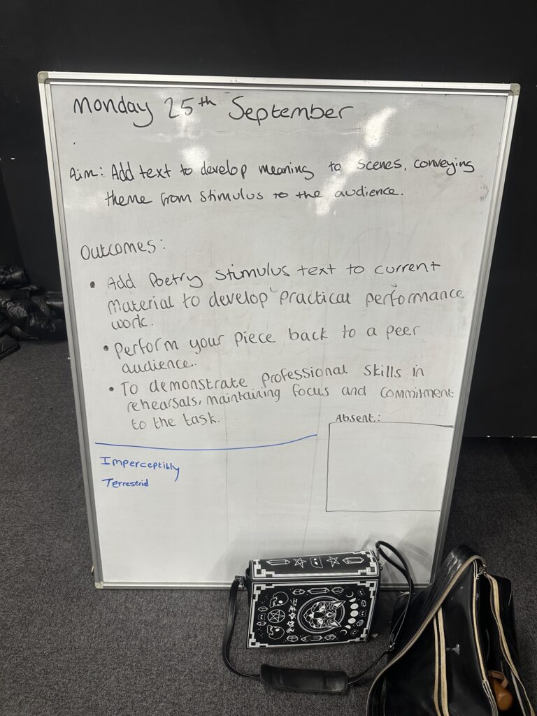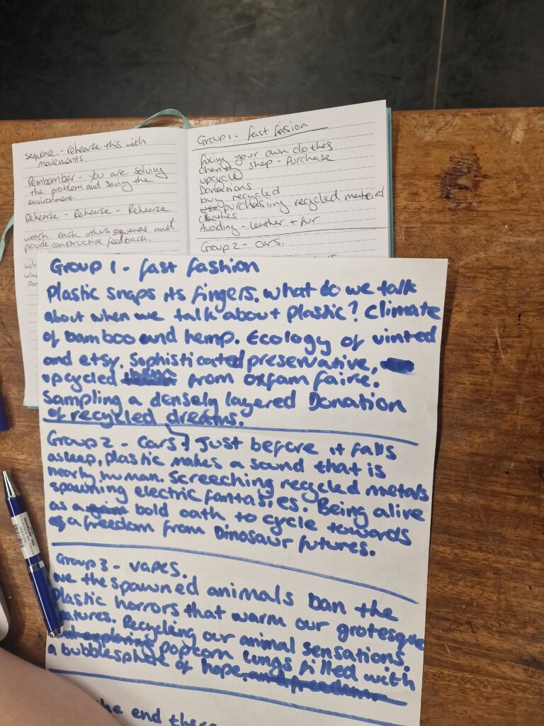 Today we really really focused on parts of the show that wernt fully developed yet and progressed them further. We added a few pieces into the show such as two peoms merged into one that myself and another cast member will be reading/ speaking during the perfomance back and forth between ourselves. one of the peoms is directly about sustainability and mother nature the other about social media and how it distracts us from our surroundings/ real life. I feel that this is a great added extra to our show as it wil give the audience and better understanding or insight into the message behind our performance.