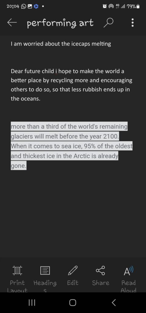 I researched and learnt about sustainability and how much our earth needs sustainability in order to be able to survive. I did this so that i have a better insight into sustainability and how it affects our earth. I researched how pollution and global warming affects the earth and how much needs to be done by society in order to protect it. I feel that more needs to be done towards the way we as a population look after our earth. To sustain it for the next generation. I also devised my own lines to use during the performance and below is a screenshot picture of this that I did in the word application on my phone.