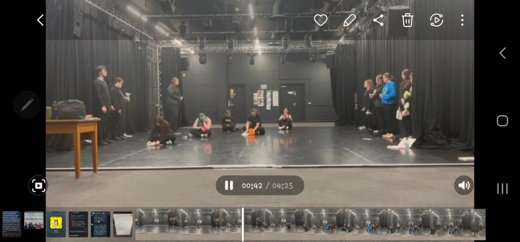 The following pictures are screenshots through a video of one of first rehearsals where we began to put our performance together and devise what we wanted to be where and how we wanted to perform it.