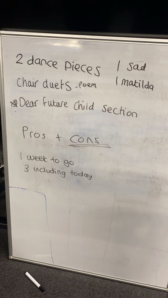 - Today we have been running through our performance and figuring out the final placements and order of the show. We have been looking further into our peices (dances and acting peices) and how we can improve and perfect them and make them as neat and proffessional as we can as a company. We have worked on our lines and our ques of when to enter and exit the stage. We created a peice around mobile device/ social media and this can take away and distract us frrom real life and also how it can cause a lack of motivation.