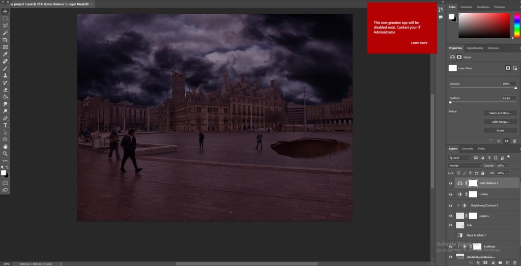 PROBLEM: The initial idea was to place a hole in the middle of the town hall however, the texture/images for this idea were absolutely nowhere to be found, there was also difficulty cutting out a hole and then using the content aware tool to fill it.