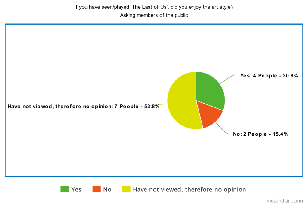 I then asked the same individuals whether they had viewed or played ‘The Last of Us’ and if so, did they enjoy the art style? Unfortunately, the majority of the people I asked about this had not seen the TV show or played the video game, this hindered me slightly as I was trying to show there is a heavy interest in the series (whether it be the video game or TV series) however, I was still pleasantly surprised that 4 (30.8%) of the people I asked did actually know the series and had a genuine interest, this gave me confidence that there are people in Bradford who would have a genuine interest in viewing my work, especially if I can mirror the art style of Nate Wells, who is the lead art director that I did my research on.