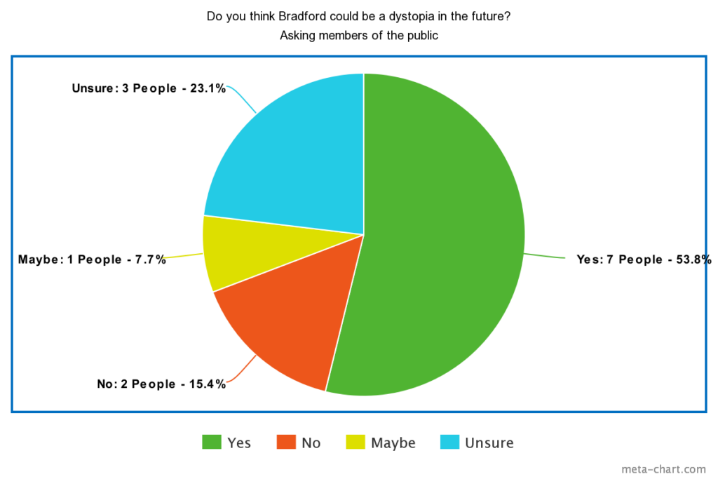 I decided to ask members of the public whether they believed Bradford could be a dystopia in the future, as you can see from my results just over half of the total people I asked (13), said they believe Bradford could end in this state, this was done to try an add some shock value and an element of realism to my piece and overall I am satisfied with the data I have collected.