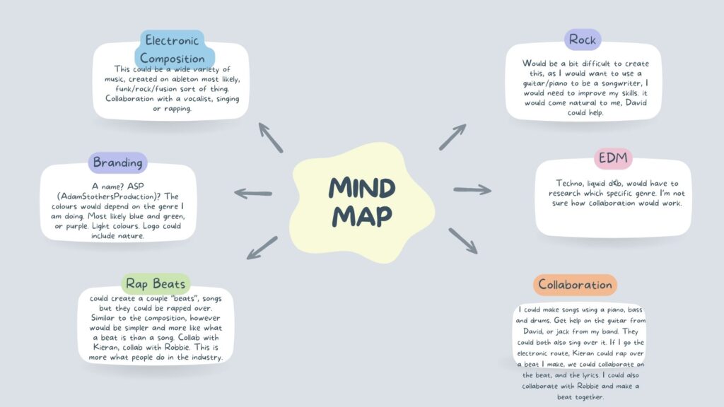 This are all my ideas for this project, as I have quite an eclectic music taste it was quite hard to narrow it down and figure out what I actually want to do and what I can do best. I ended up going with a mixture of the electronic composition and the rock idea. As I would like to create guitar or piano music, that is quite chill and mellow. However as I can’t play the guitar, I will use Ableton to create these tracks. I am thinking of making the tracks on Ableton, and playing some of the parts live and overdubbing them. I could play the bass guitar and drums. I do enjoy EDM and rap music, however they are not the type of music that I want to create at the minute. With my limited skills on DAW’s, I would like to create music in a genre I am more comfortable with and a genre that I will enjoy making more. The name that I came up with was the first that came to my mind, and I think is quite good. ASP is quite easy to remember, stands out and has a personal link to me. The collaboration is still something I am yet to figure out, however vocals are something that I will most likely need help with. I am also thinking of the guitar parts being played live by David.