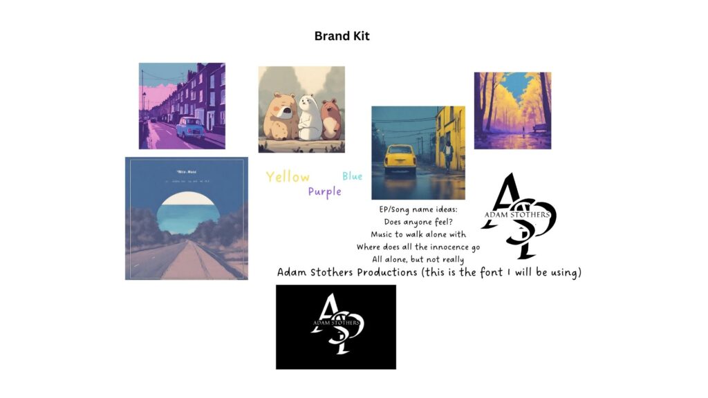 This is the brand kit that I have made for this project. My logo is on there, with a colour inversion so it can go on both a white and black background. The original is still my personal favourite. The font that I would like to use has also been mentioned in this brand kit. I prefer fonts that are smooth rather than sharp ones. I would also say this font is quite bouncy as well as being quite relaxing and gives off a nice vibe. Some might say that it is an unprofessional font, however as it is for a musical brand I don’t think it needs to look that professional, it just has to fit with the rest of the branding. The colours I will be using are also mentioned. I used a colour wheel to decide upon these colours. I wanted to use yellow and a light blue, and I found out the complementary colours of them two. With yellow’s being purple and the blue’s is orange. I decided that purple would fit a lot better than orange would. There are also some textures on here. I created these using Canva’s AI Image Generator. This works by placing key words into this generator, and then it will come up with 4 different ideas. Some of the words I used were, blue, chill, mellow, indie, yellow, indie music, sad, animals, backdrops, purple. By putting in a different mixture of these words, I ended up with these images. Four of them have a similar vibe as they are colourful backdrops, and I put the animal picture in as I thought it looked quite adorable and I quite like writing about animals, so it could be used in this project. I imagine these to be single covers or a cover for the whole EP. There is also a few potential names for songs/the EP on it. I was going for quite a mellow and sad feeling as well a being introspective and questioning. I personally like these kinds of names, as asking the listener a question or making them think about themselves can make them relate to the track, making them connect with it therefore they have a chance of liking it more. These names or not final, they are just ideas and will most likely change as the songwriting process goes on.