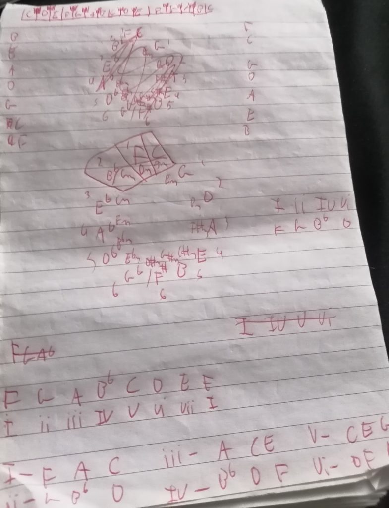 First of all we had to do a plan. This plan involves writing it all out before we put it onto Sibelius. This would stop any mistakes happening such as any random key changes, our chord progression getting lost and playing the wrong notes, as it’s all planned out. This plan included creating writing out a cycle of fifths, which includes writing out the order of sharps and flats; writing out the scale; then picking a key signature and figuring out how many sharps or flats it has; writing out all the chords for it and then picking the chord progression that I am going to use.