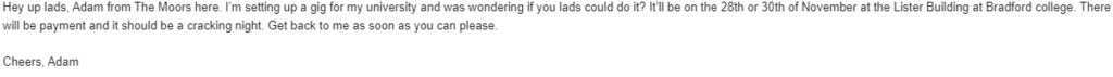 Most of these jobs and skills apply to me for this gig, however some of them are done by someone else as that is their specific job. There is an artist liason so I won’t be dealing with personnel. However, I have been in contact with bands. That is only because I know the local music scene as I am a part of it, so there’s more chance a band will say yes if I ask them. Once the band is confirmed, the artist liason will do the rest. The schedule is decided by everyone, not just the manager. I will need to budget, as we are thinking of splitting the profits between the artists and a charity. So I will need to figure out how we are splitting it and how much each act gets. There is some networking to be done, as I have to write a formal letter to parents and a formal email to staff inviting them to the gig. This is very specific to this gig that I’m doing, as it is a university gig. Most gigs you wouldn’t send a letter inviting people. But I thought to take advantage of the situation that I’m in and get as many people as possible to come down. The rest of what it mentions are skills that I need. I’m not the best at any of the skills it mentioned, however I have played quite a lot of gigs so I have experience of what a gig entails. I am also ready to take on the challenge and I think I can do a good job of it.