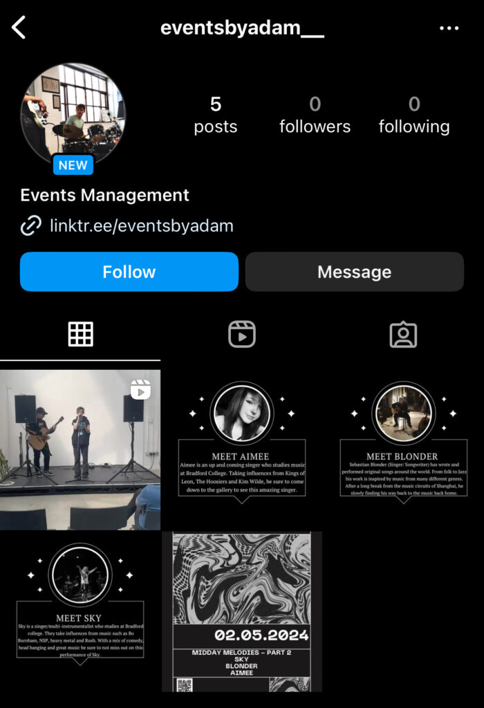 Live Music Marketing Portfolio Poster Linktree Link Eventbrite Link Instagram Instagram Meet the artists Evidence from the show