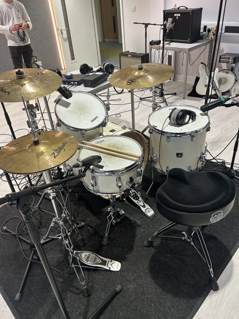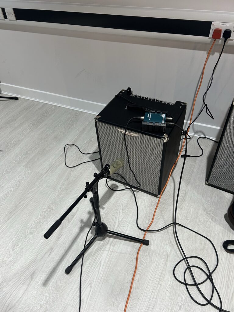 I used a microphone on every drum on the drum kit, as I wanted a clear sound for everything. I chose the D112 as it is a well known and high quality bass drum mic. It can handle up to 160db which makes the bass drum not distorted, and it’s frequency range means the sub bass, at 100hz or below is captured really well, and it is boosted at 4k hz so it helps the kick cut through the mix.(AKG,2015) I used two snare drum mics, one in the usual position on top of it, and one underneath. The underneath one ended up sounding really bad and will not be used in the final product. I chose to use the SM57 as it is a very commonly used mic, not only for drums but on many other instruments, as it reduces background noise and instrument spill better than other mics.(Shure,2023) I chose the MD421 microphone for the toms as it is a popular mic that makes the toms sound good. The hi hat can be recorded separately, but I thought just having overheads would be enough. However as this song is mainly played on the hi hat, having a separate mic for it would’ve been a good idea. I used the at4041 as it is ideal for cymbals due to it’s 80hz cut off and a boost in the high frequencies.(audio technica,2025)