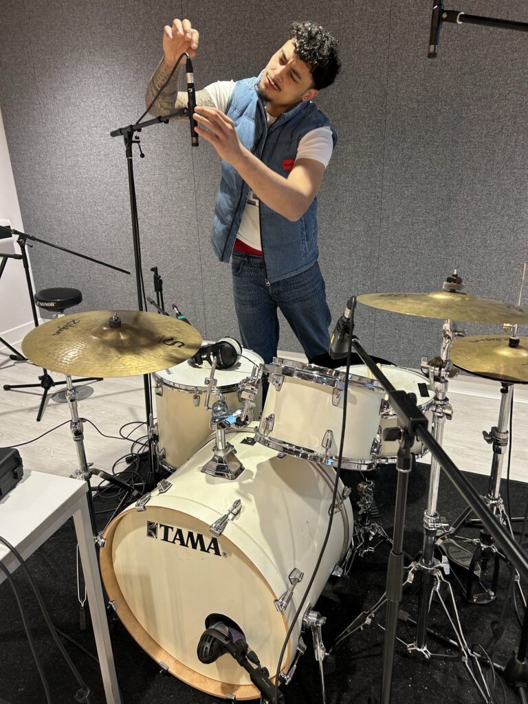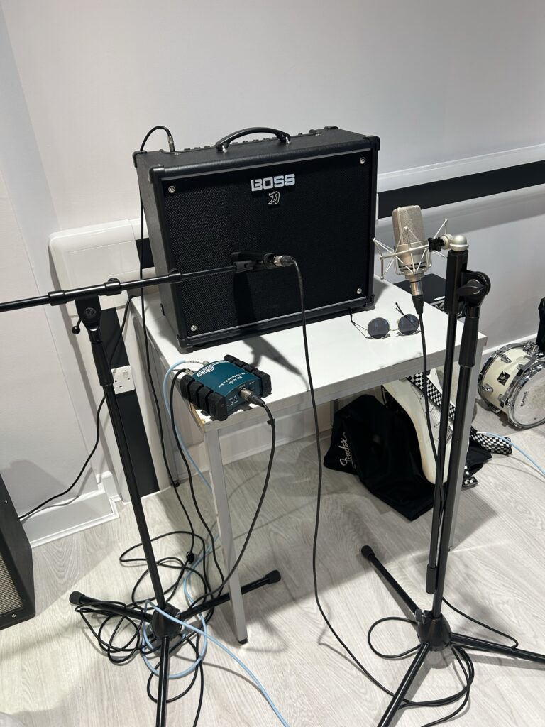 I recorded bass, drums and rhythm guitar at the same time. We did 3 takes. However, none of these takes were perfect on the drums, I should’ve listened to it fully and made us do another take.