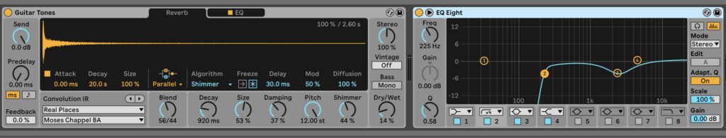 Guitar effects. I used a digital amplifier to make it punchier and add a different sound to it, a chorus effect, and reverb to make it sound full and I also did an EQ. I think this guitar sounds great, however, I could’ve spent more time on the EQ as it was done quite quickly with only one listen to check how it sounds.