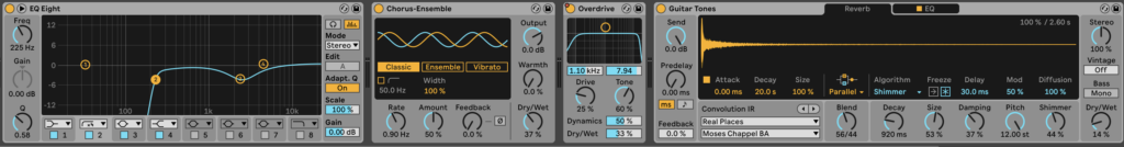 Lead guitar effects. I copied and pasted the chorus, EQ, and reverb effects from the main guitar onto this. I did add an overdrive effect, to boost the volume in a nice sounding way. The same improvements for the main guitar also apply here.