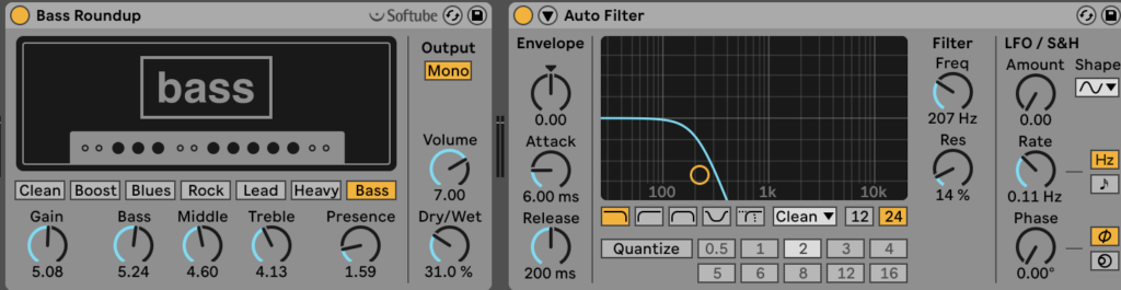Bass effects. I used a bass amp to make it pop more, and a filter to remove the low end buzz this bass created. Both these effects do a good job, however an EQ and some reverb could’ve made this bass sound even better.