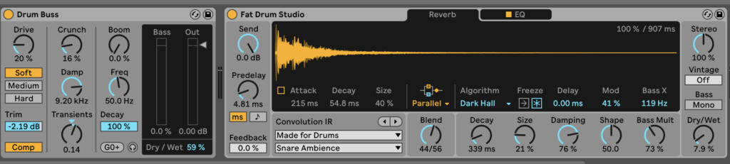 Drum effects. I used a drum buss, which acts as a compressor and as some other effects, and a drum reverb. I could’ve used an EQ on the drums, but as it is one drum kit and not a separate channel for each drum, I thought it would be best to leave the EQ so it doesn’t get messy, it also sounds good like this.