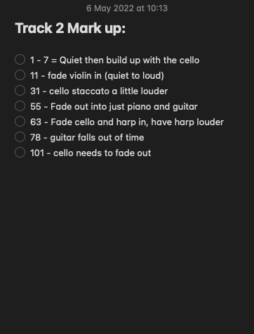 Guitar is very quite and there’s a lot of spill in the mix so we’re going to try and rerecord the guitar separately to get a clearer sound. Slightly out of time but it’s not too noticeable.