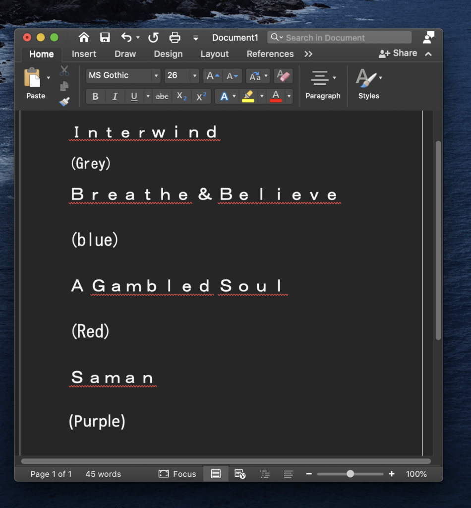 I then went into word and played around with different track fonts until I found the one I liked the most. The colours in brackets are tying the tracks to what colour smoke each cover art will have.