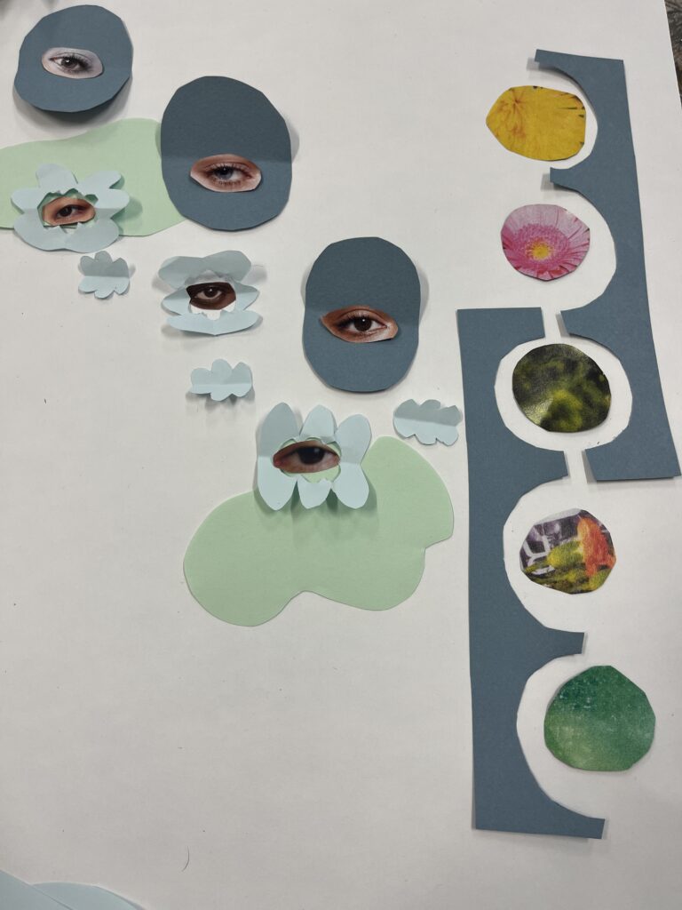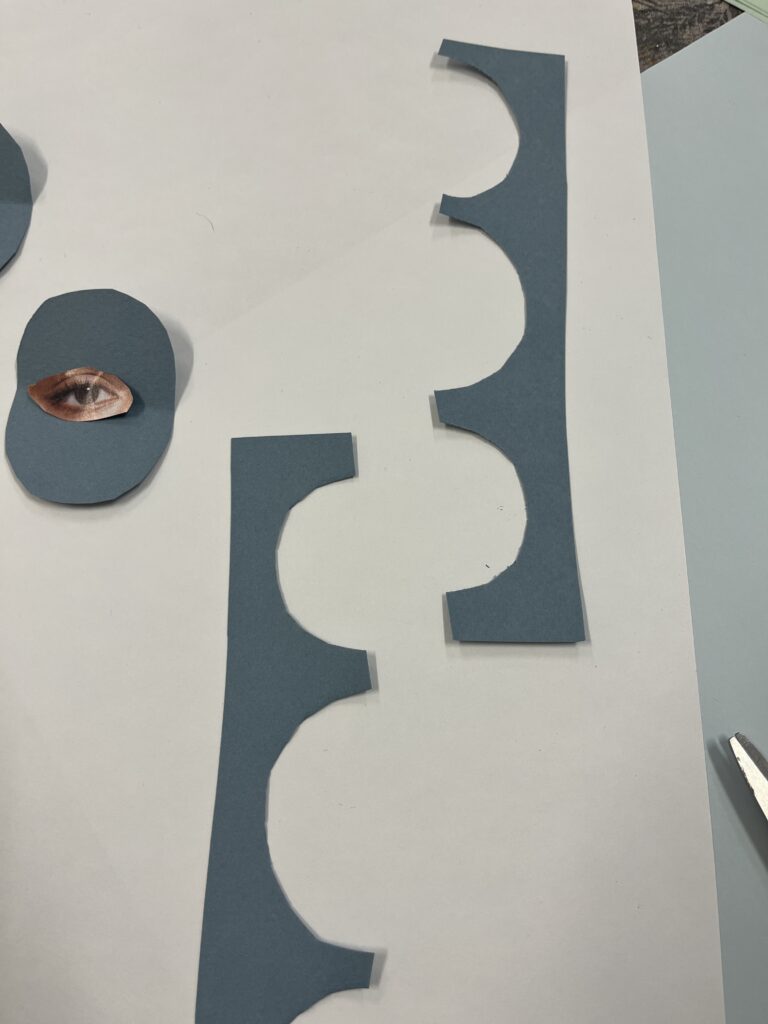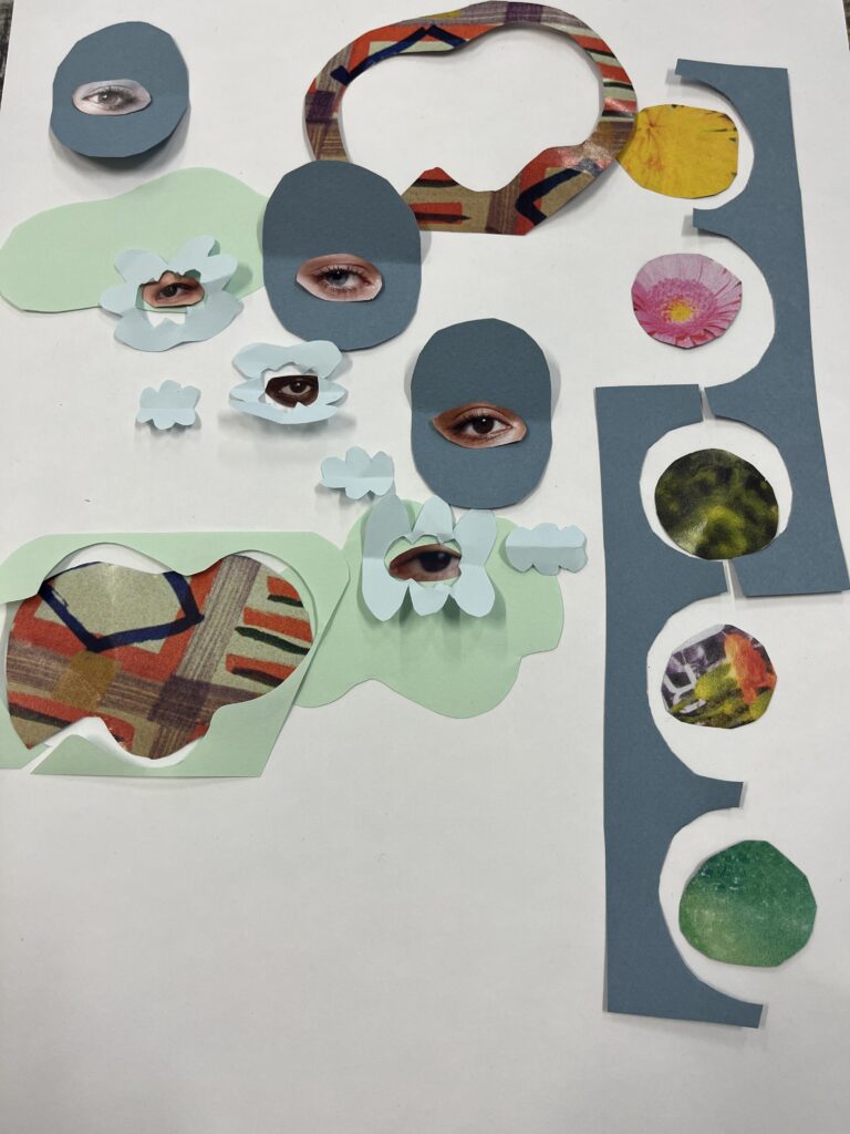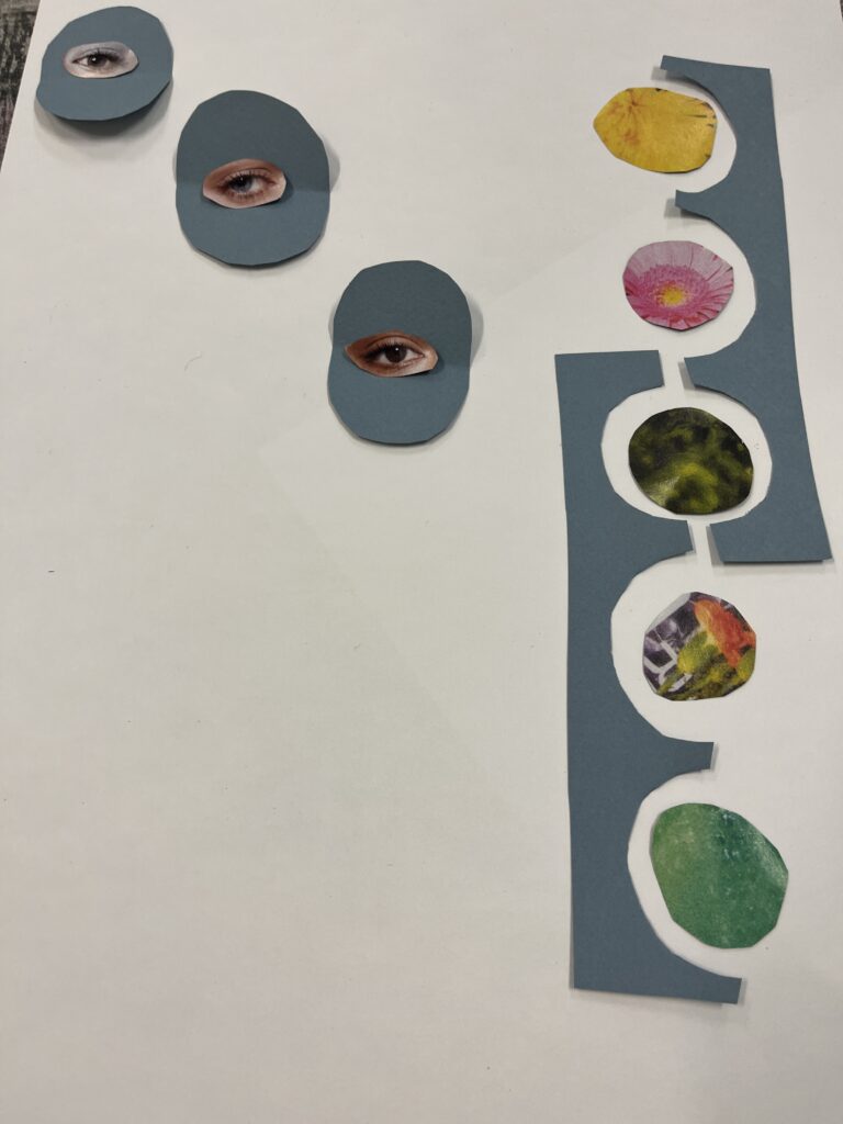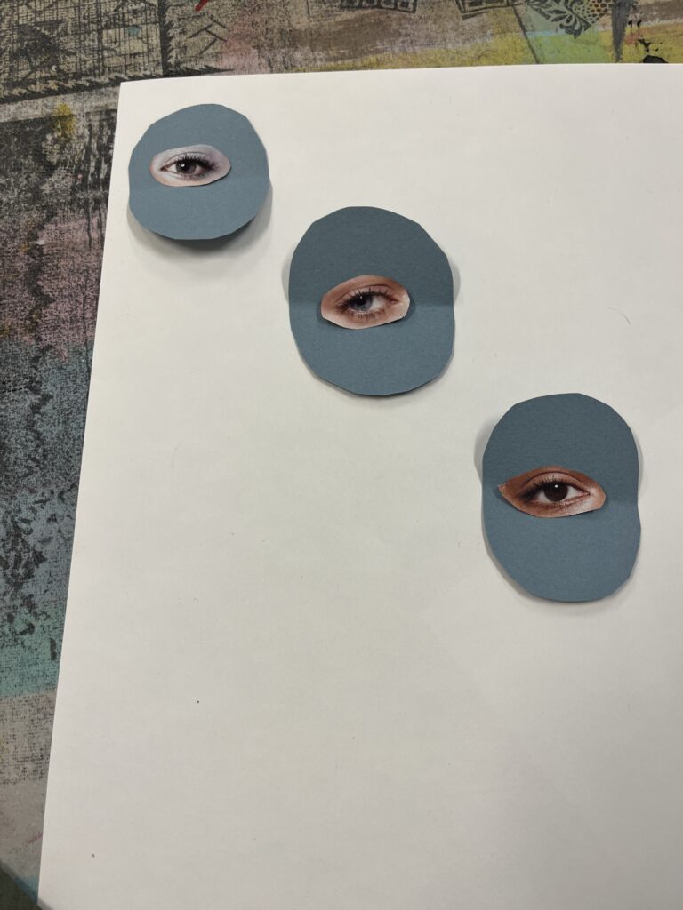 started off by making circles with paper, then adding in eyes i cut from a magazine to fit in with my theme – placed these diagonally.