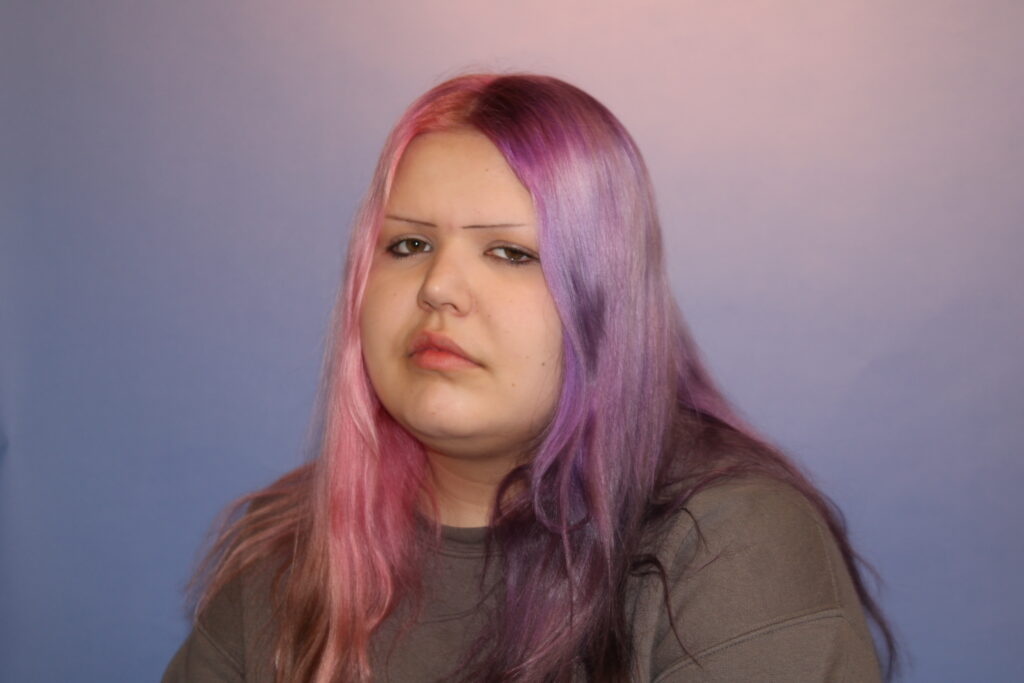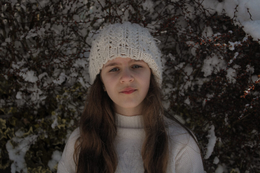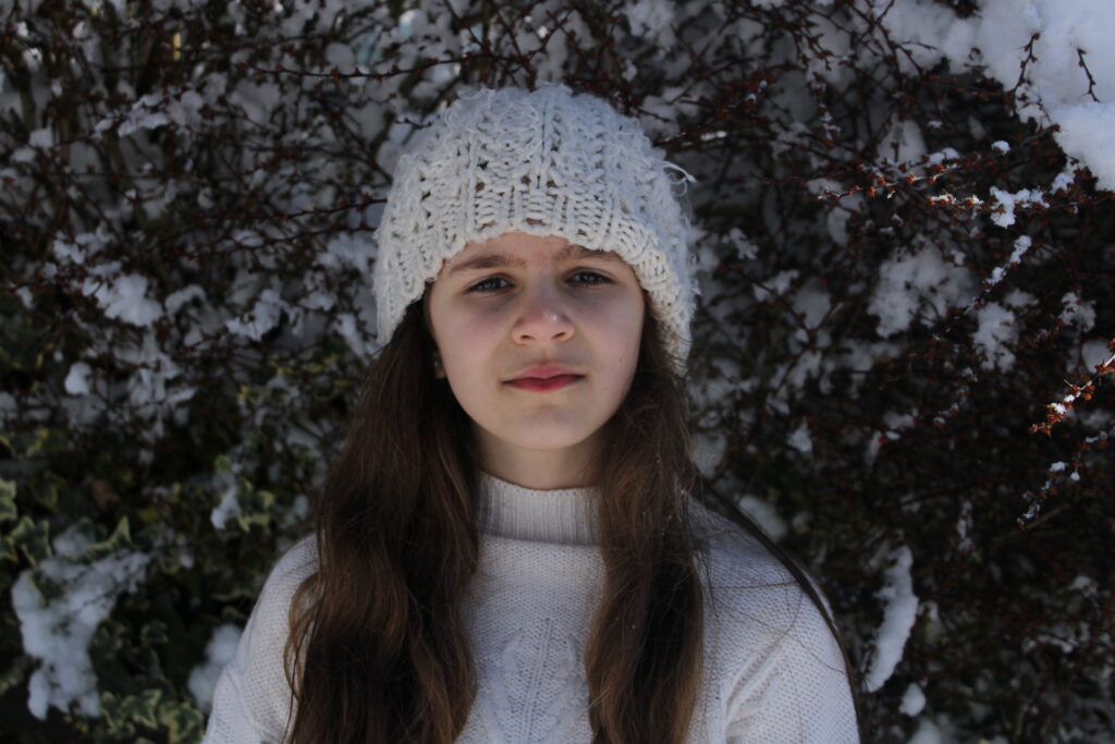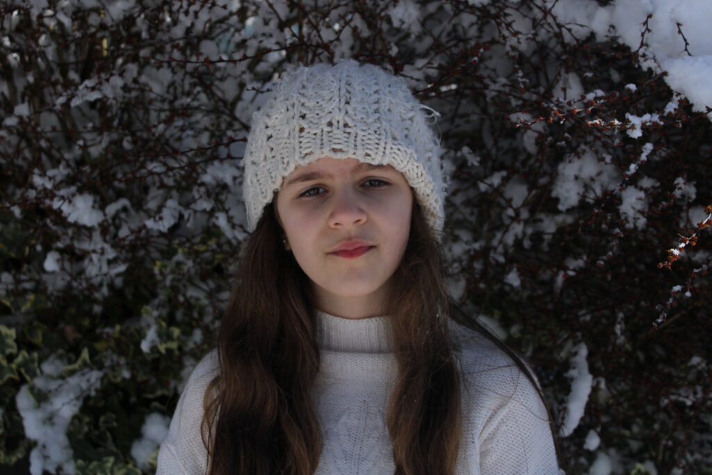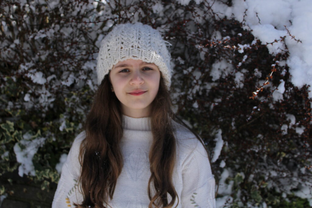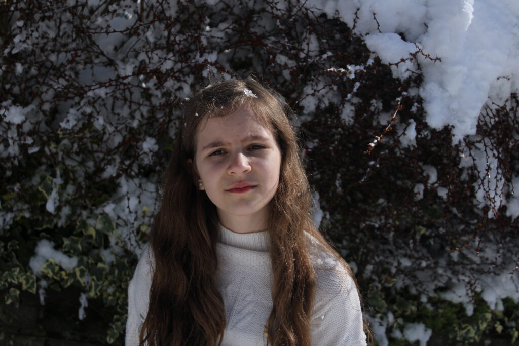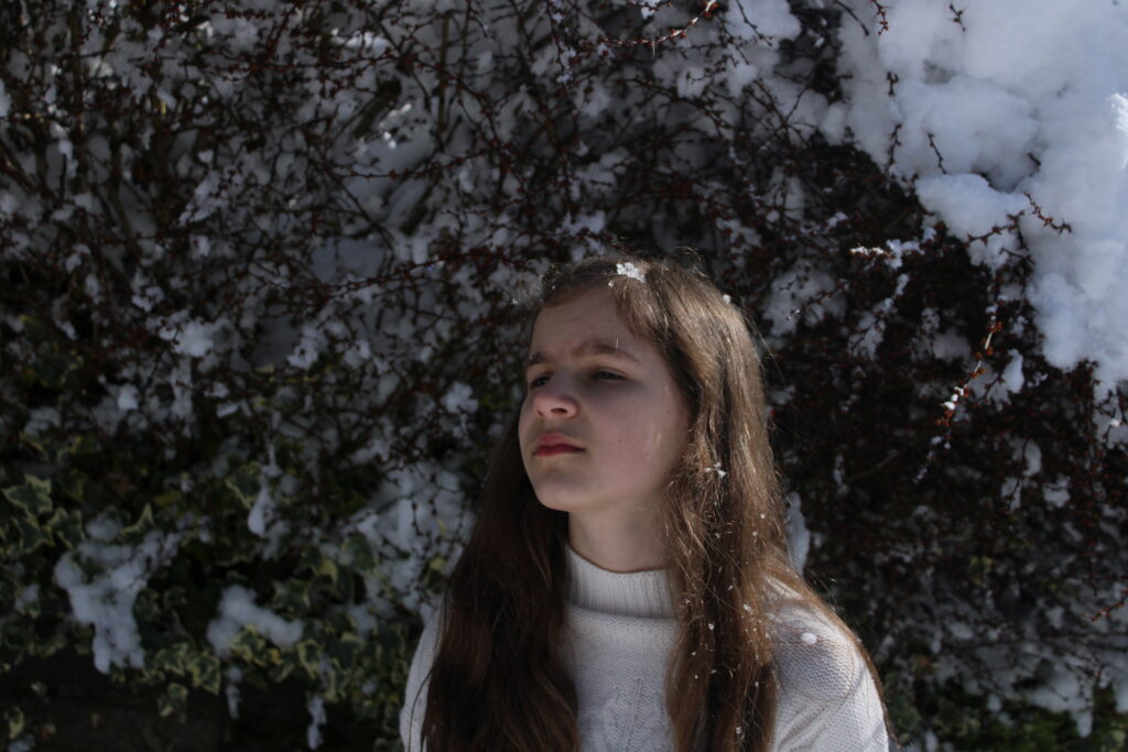 i liked the background being the snow as i like the significant contrast of the snow with my sisters hair.