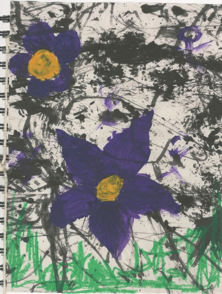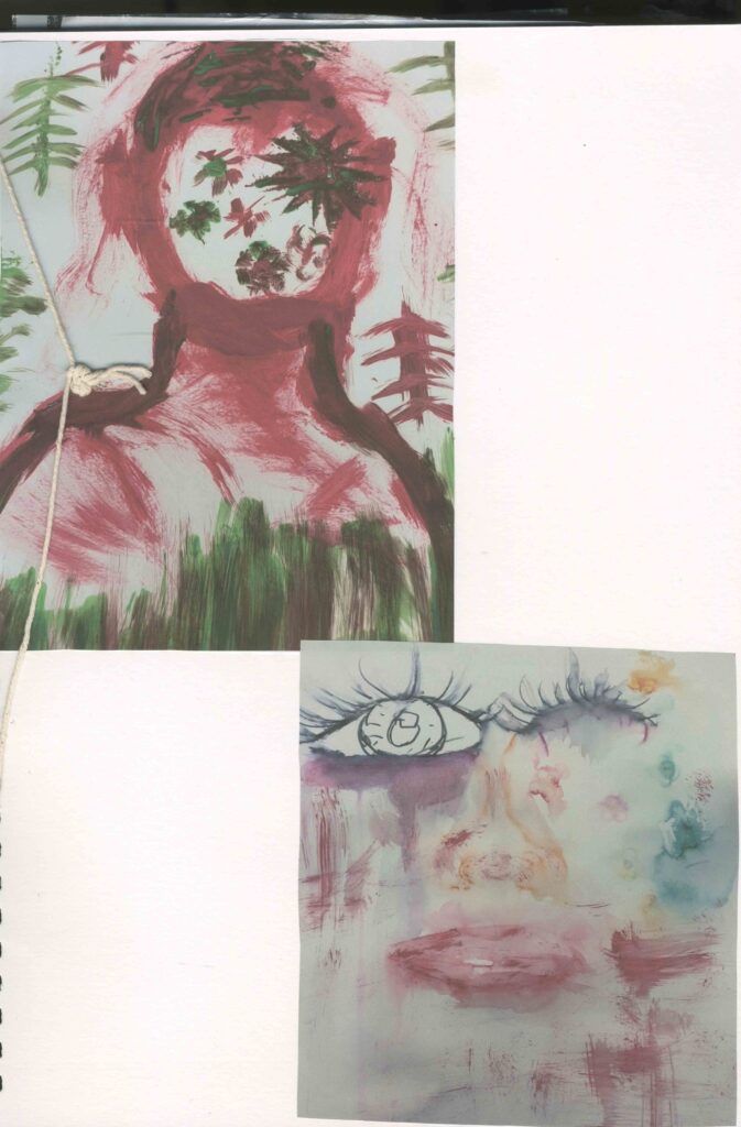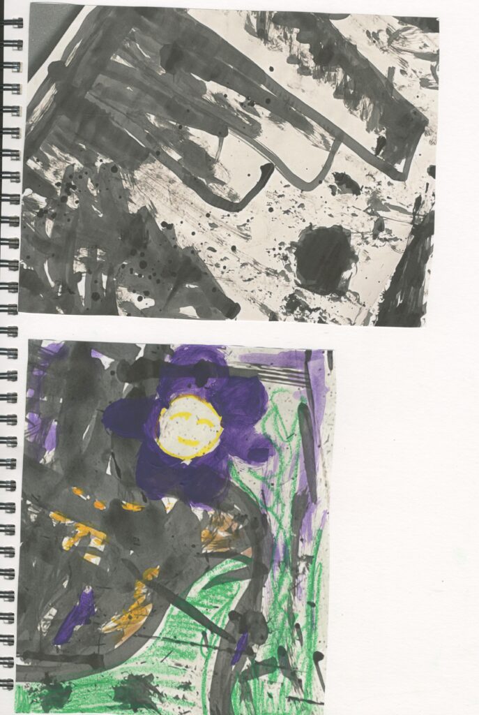 I also decide to use acrylic paint : purple and yellow as well as some green oil pastel. I used these to create some extra textures and bright sticking colours. Because my theme is based around concealment of portraits and nature, I decided to paint figurative flowers and I added faces to them to show that they are concealed within nature. The green jagged lines and scribbles, represent grass.
