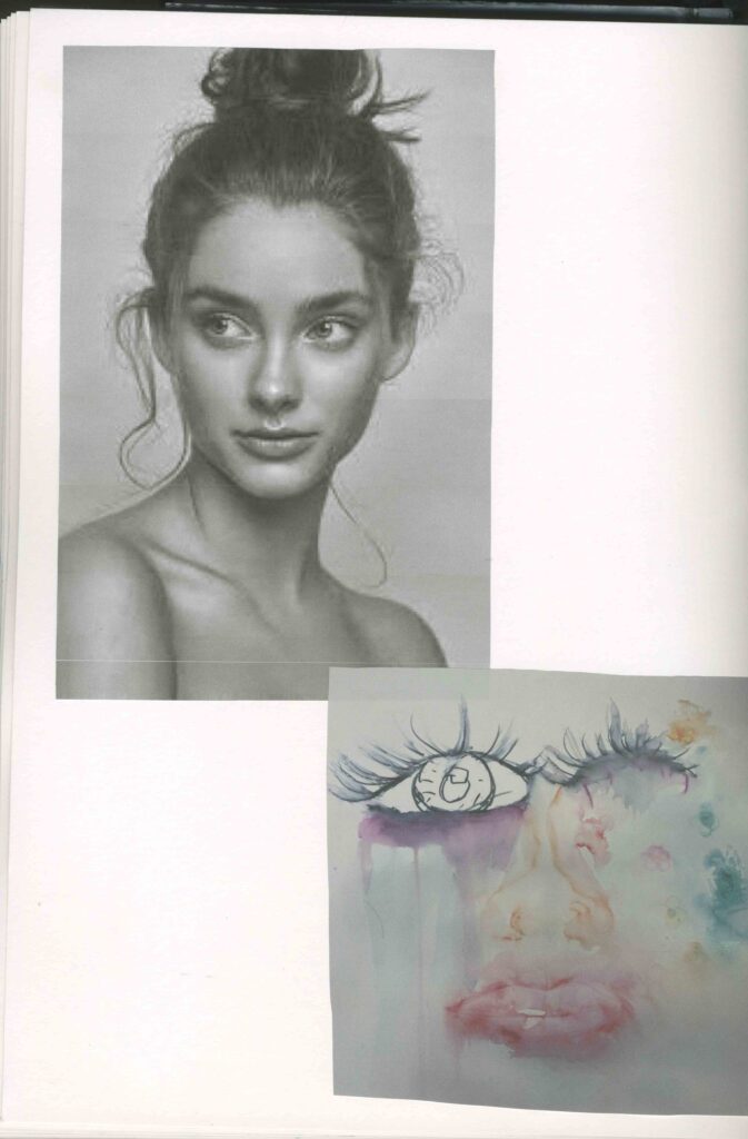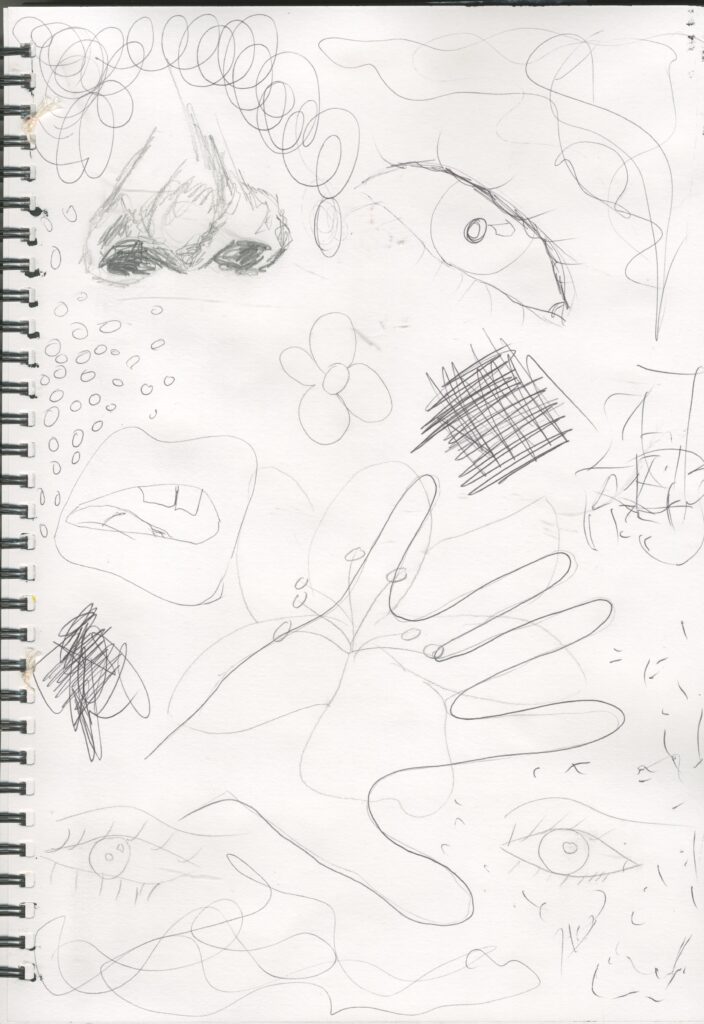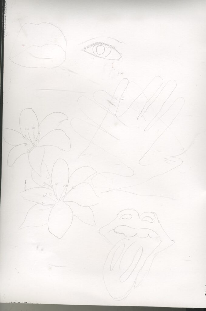 I have drawn some quick sketches of facial features and flowers as well as including some mark makings because I want to use human form and nature. I also took inspiration from the Rolling Stones logo of the tongue and traced around my hands overlapping to show that it is trying to conceal something. The mark makings can help to create a sense of emotion which if something is concealed, it can create a feeling of isolation.