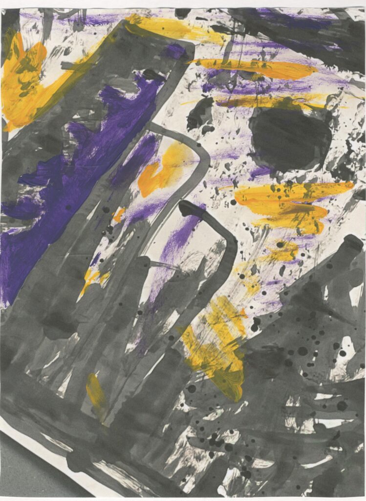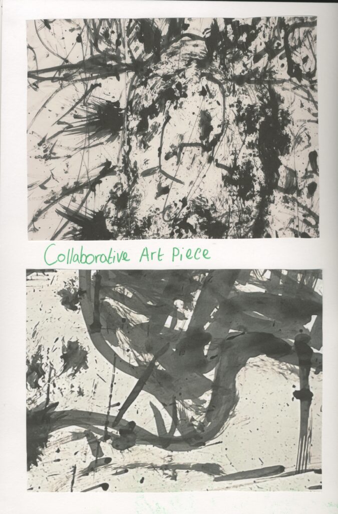 Created with a bamboo stick and paint brush attached to the end of it as well as some bubble wrap which I taped onto the end of the stick and black ink. Reminds me of mark making , Alana Dee Haynes, frottage, collagraph .