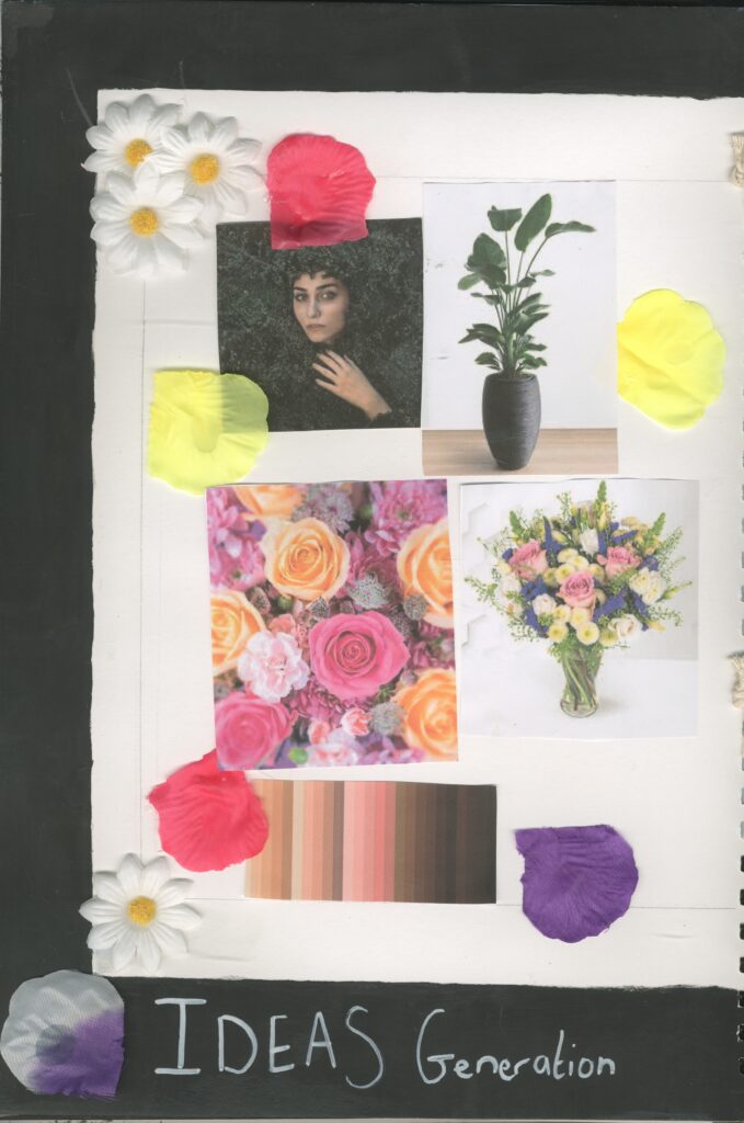 I created these with photo copies of my previous work. I used my acrylic flower prints and my acrylic painting of a flower. Similarly to my fashion garments I designed, I used them to create side profile figures heads that remind me of negative space. And like the fashion one, I used black and white images and coloured images.