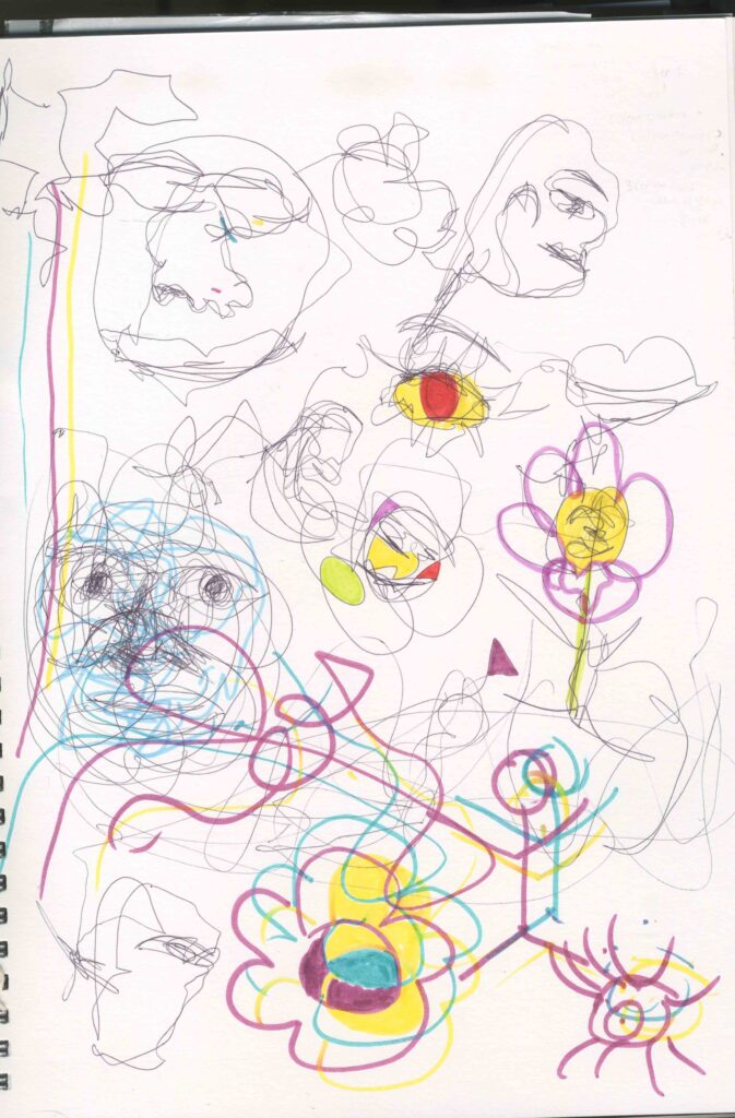 I also decided to try this again however I drew these spontaneous drawings in a continuous line, as well as using coloured pens to scribble on top and block out some areas with colour.