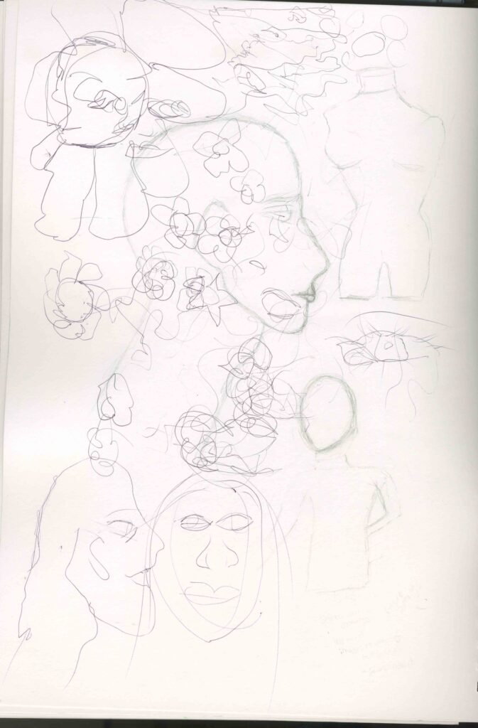 I drew some spontaneous drawings on top of some figure drawings of mannequins. I did this by using my less dominant hand (left) and with my eyes closed. As well as this I drew some flowers and scribbles.
