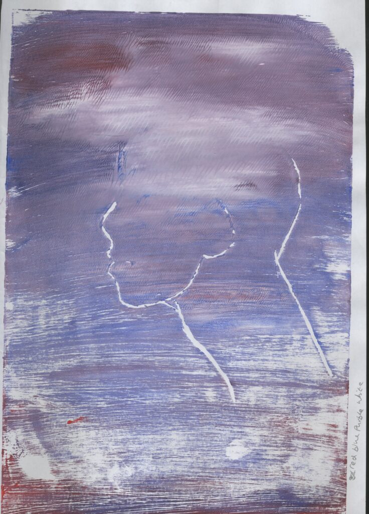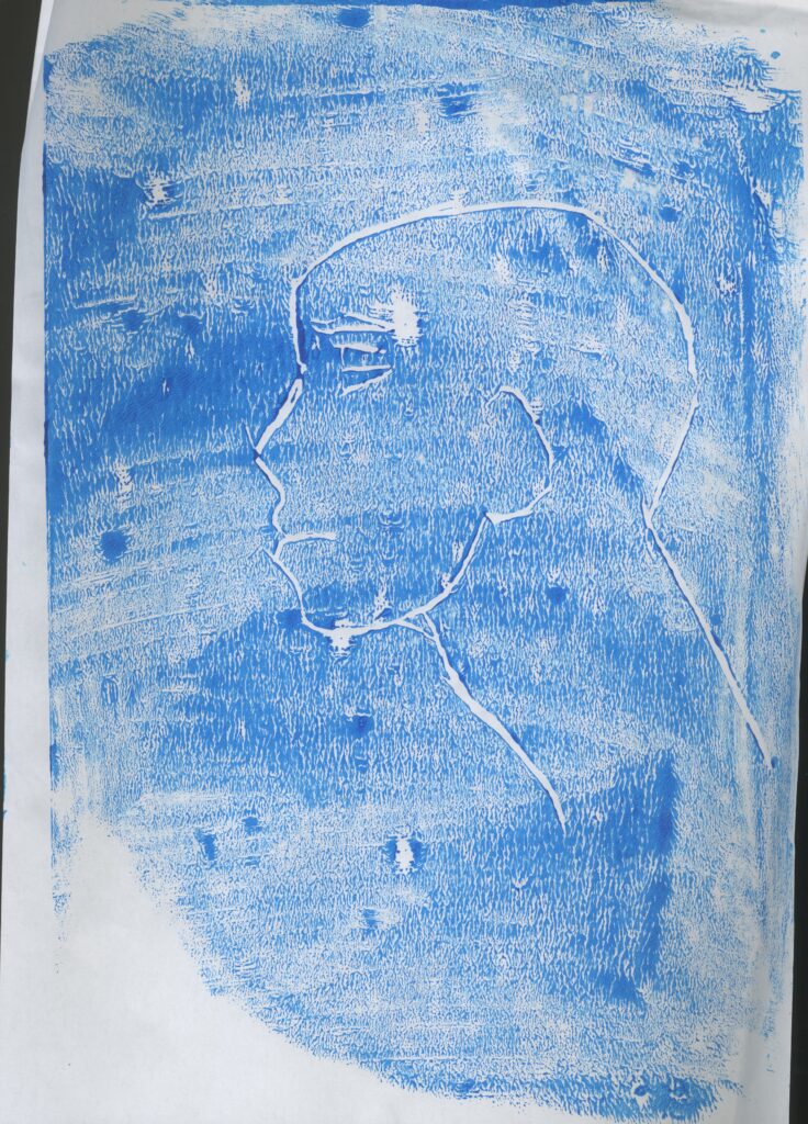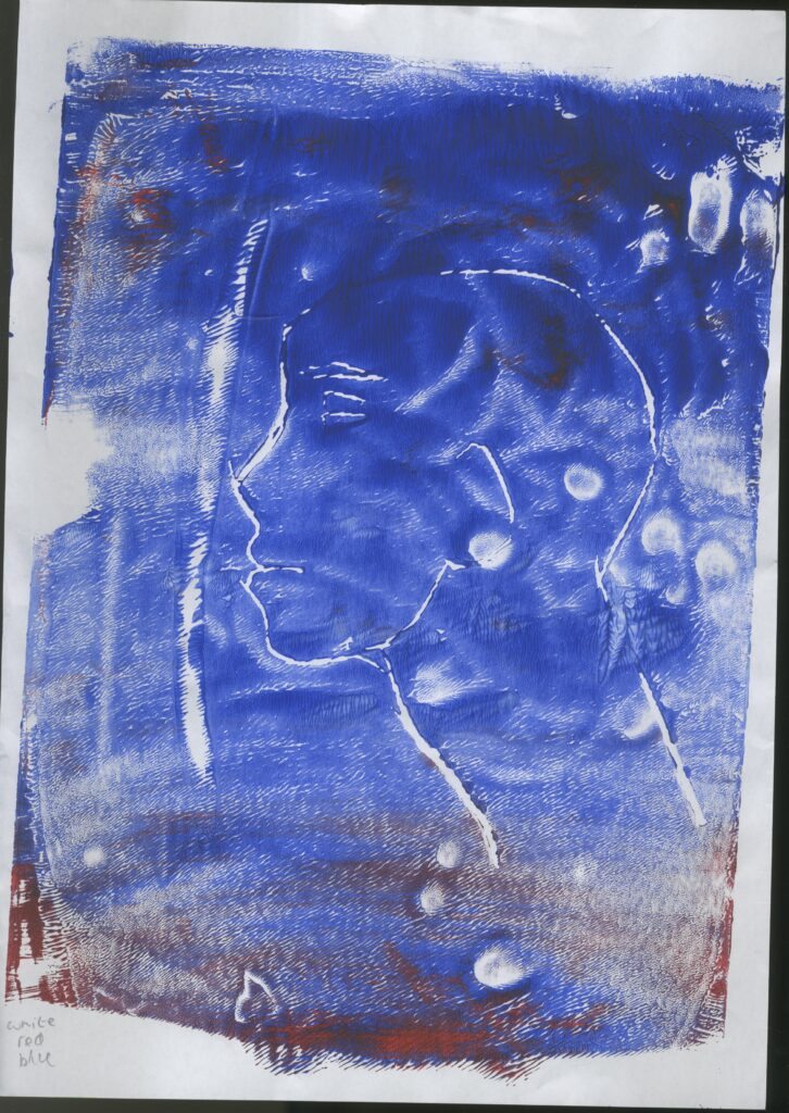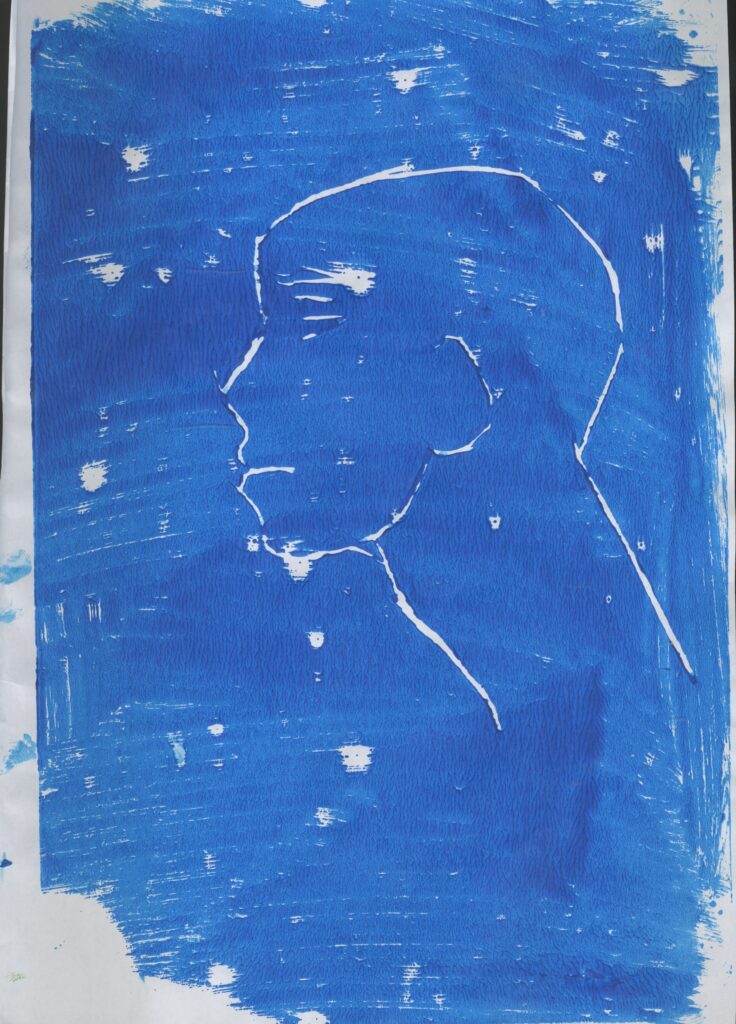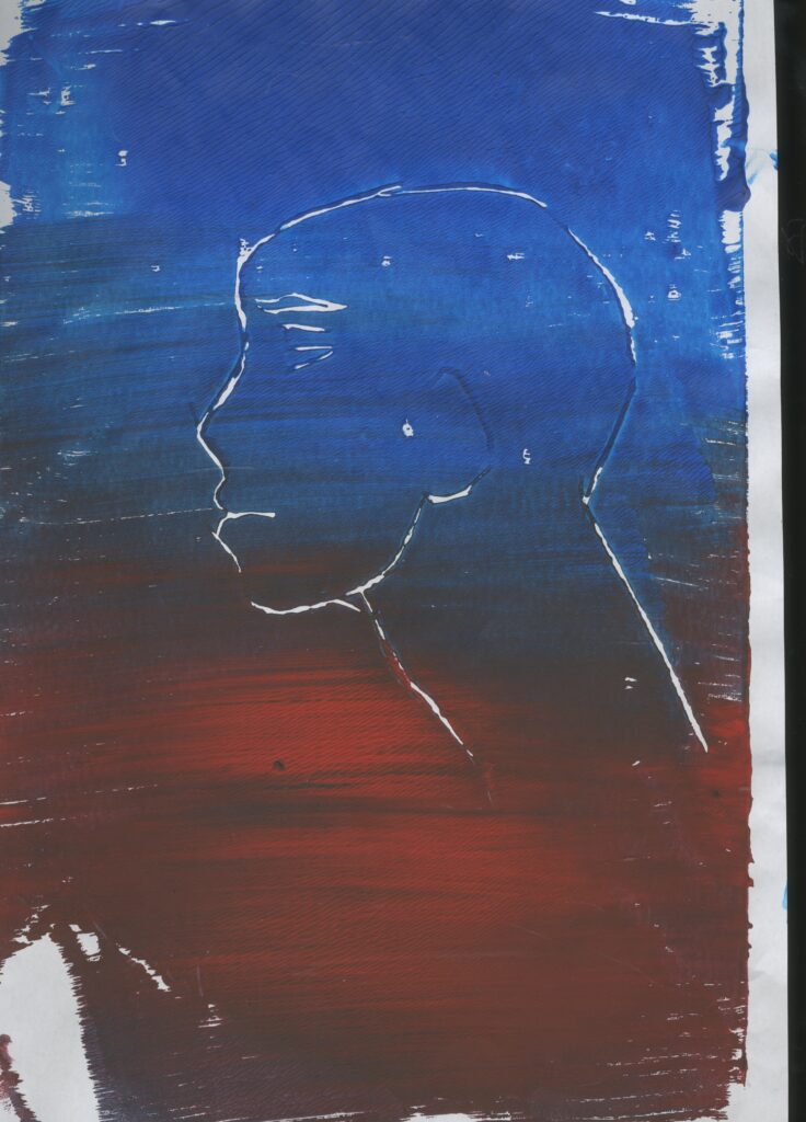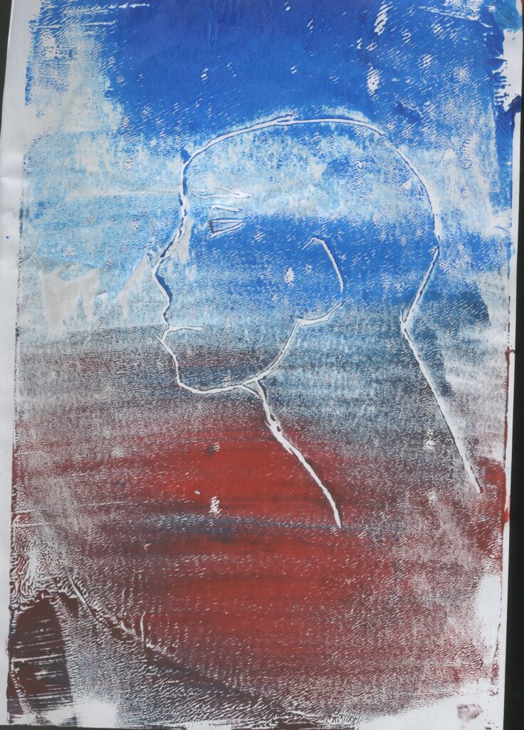 Then I printed images of a side profile face . For the first image, I used blue and red ink. This was successful. I also like the random splashes of red with the blue because I used the perfect amount of pain. It printed very well and I can clearly see the figure.