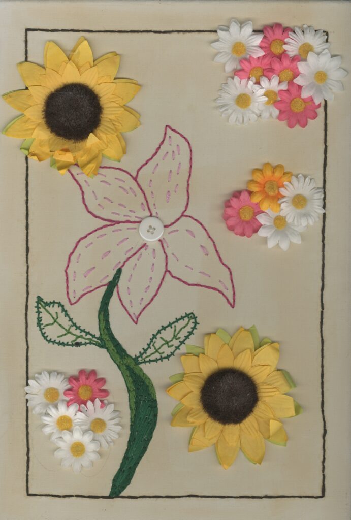 Because I had all ready drawn in pencil the flowers which I was going to sew, I tried to remove them with a rubber but this was unsuccessful. I think this is because I was working on a canvas. To solve this problem, I used a hot glue gun to stick the flowers on top of the pencil remains.