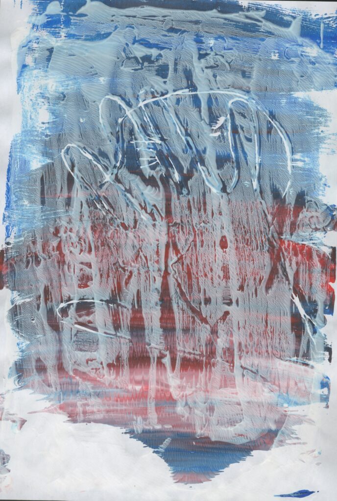 Then I tried this again. First I printed with red and blue gradient then I printed on top with white paint. Even though I used a lighter colour on top, the still didn’t work. It looks dull and it dosen’t remind me of nature.
