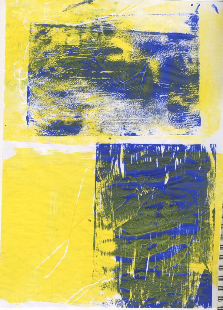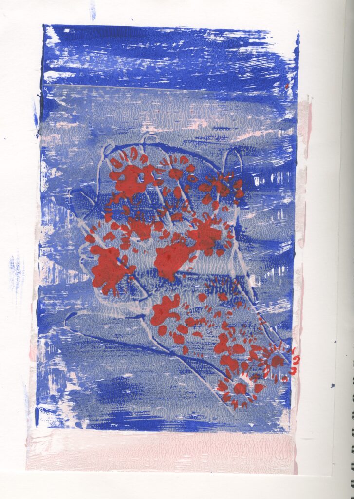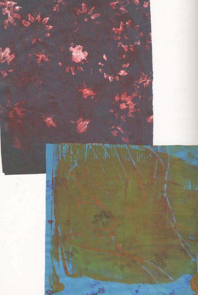 Then I tried this out again twice and these were very successful. I think this was because I chose complementary colours of the blue and orange . I also only printed one image in the centre of the page which I prefer to the other ones that I have tried.