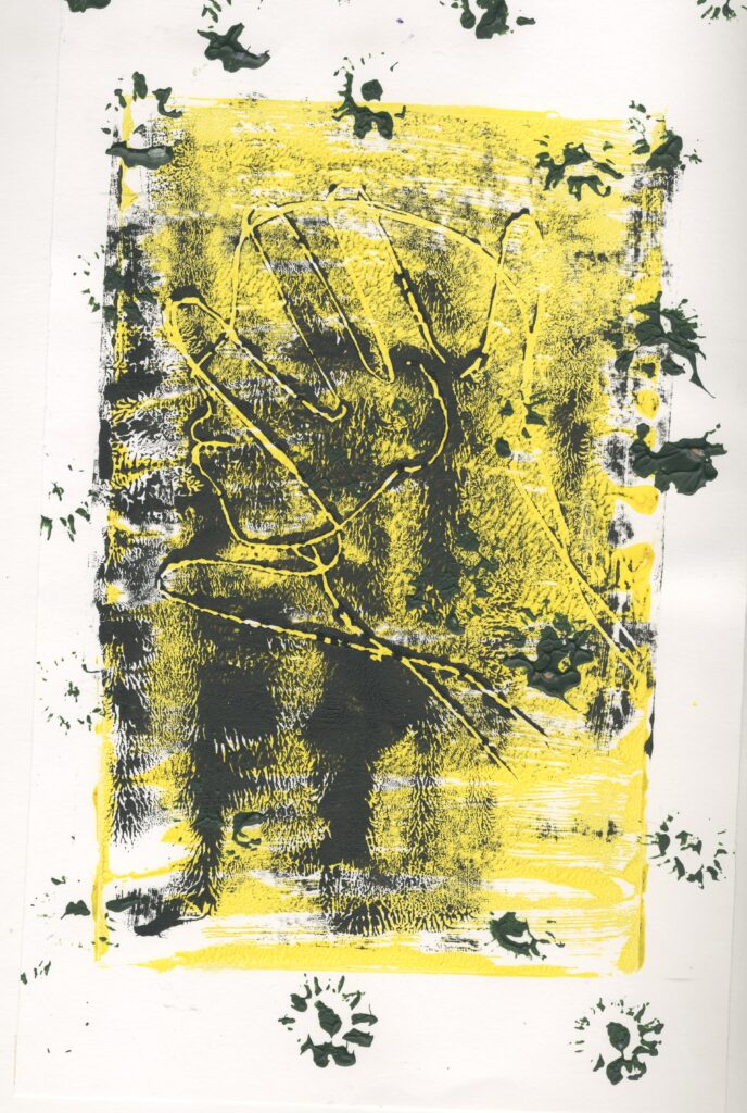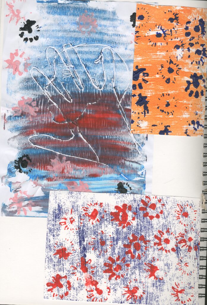 At this point, I was struggling to figure out how I was going to incorporate the elements of nature into my final outcome. I decided to resort back to the flower prints that I made earlier on in the project. In the same way to those , I pained the background and used a different colour of acrylic paint to print the flowers.