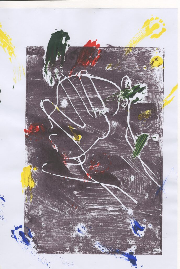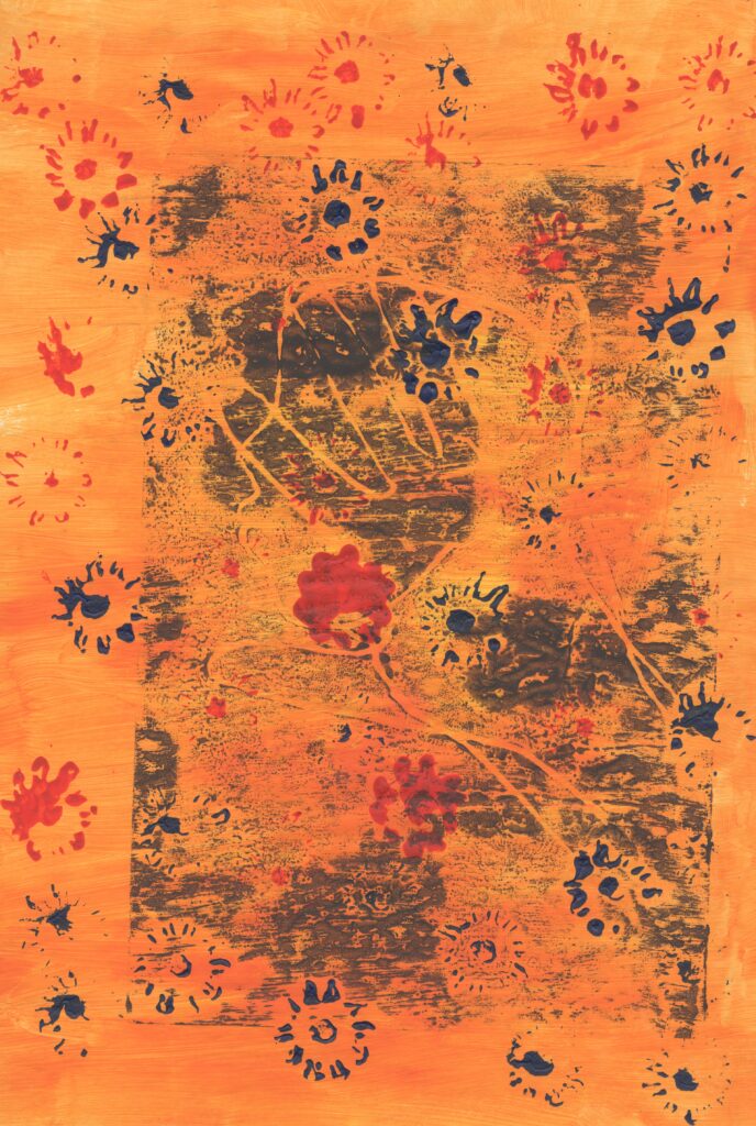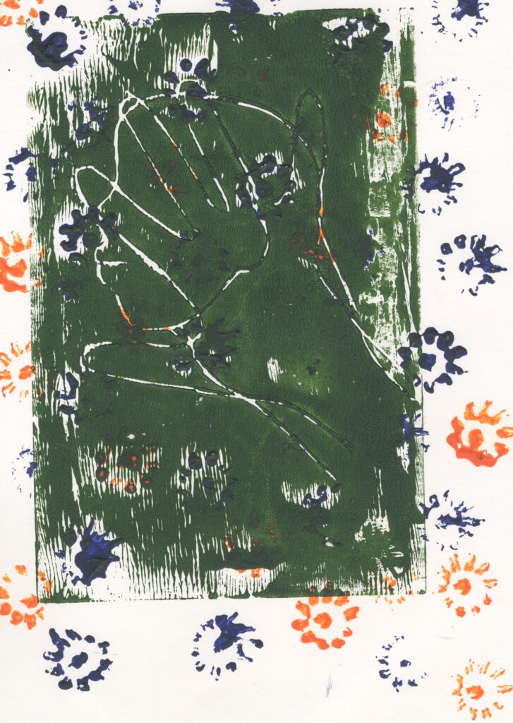 I also tested out using the flowers to print on top of the figure using red acrylic paint. This wasn’t as successful as the one with the flowers randomly placed round because it reminds me of nature is all around us and the flowers in this one are just in one place.