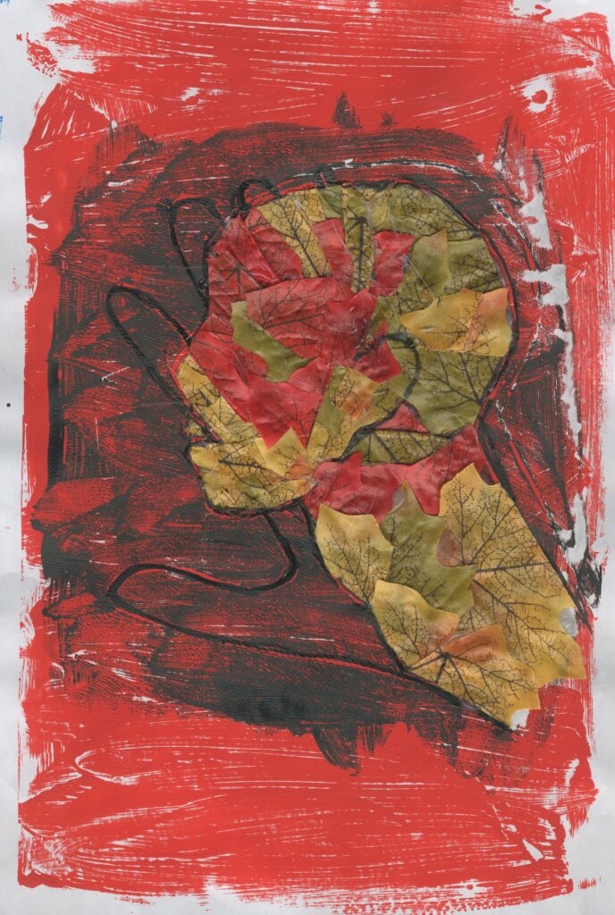 This one is my most successful result. I used red acrylic paint for the background and I printed my design with black acrylic paint . Then I collage the figure with fake leafs. I like this because the figure is blocked out and it’s being concealed with in nature and the silhouette of the figure’s face is being hidden.