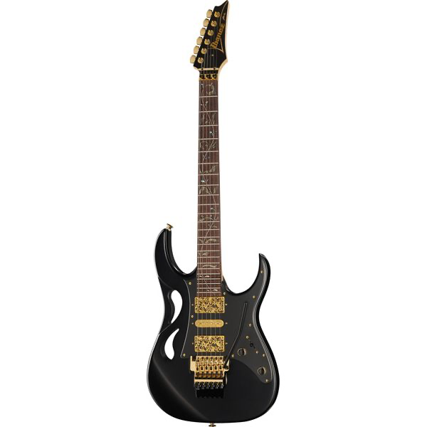 Steve Vai signature guitar- His signature guitar consists of a black matte finish with gold pickups and a gold Floyd rose bridge.
