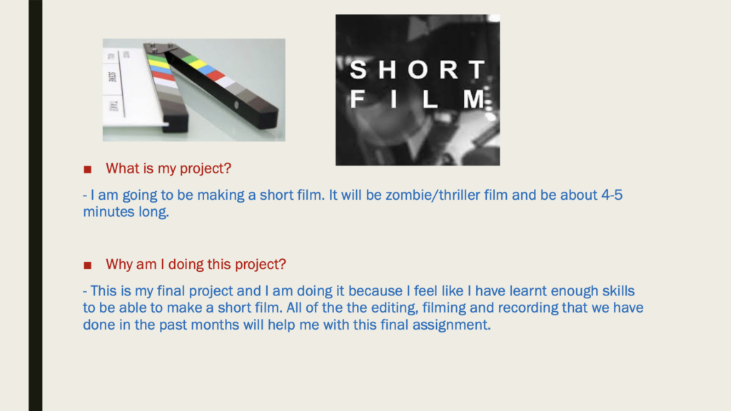 This is my final project and I am doing it because I feel like I have learnt enough skills to be able to make a full film. All of the the editing, filming and recording that we have done in the past months will help me with this project.
