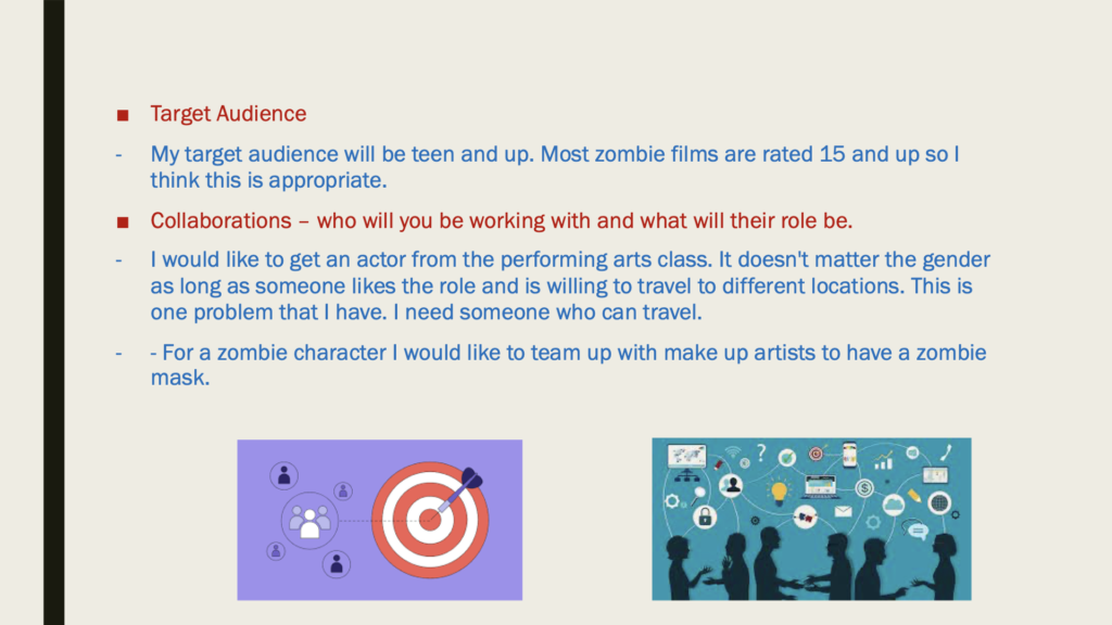 My target audience will be teen and up. This genre is for people who like apocalypse shows and films. I will need to make it accurate so I will research into other zombie films. I will look at different directors and behind the scenes to see how they film and what they do to make apocalypse films.