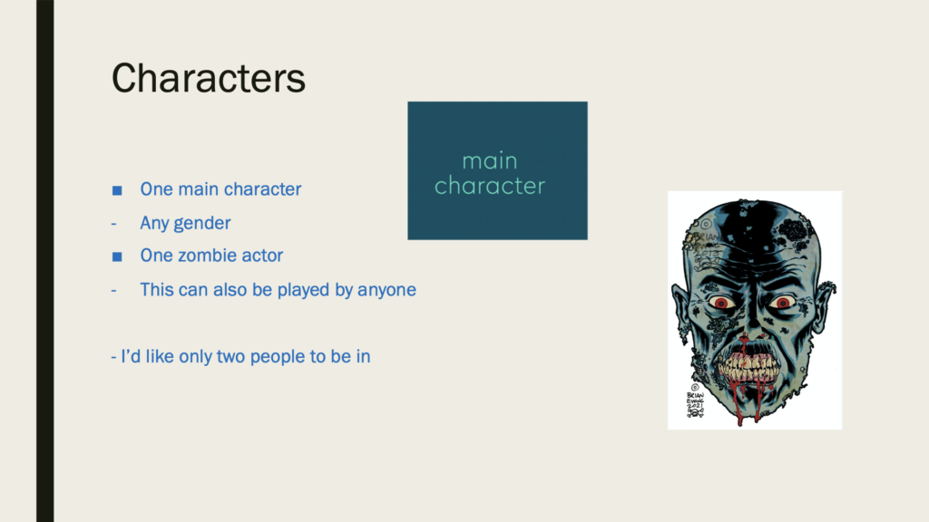 For a zombie character I would like to team up with make up artists to have a zombie mask. I’d like the mask details to be shown in the film.