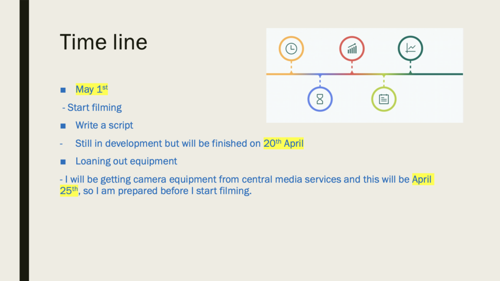 I would like to get an actor from the performing class. It doesn’t matter the gender as long as someone likes the role and is willing to travel to different locations. This is one problem that I have. I need someone who can travel. If i cannot find anyone I may have to be in the film myself or find a friend that I know who is willing to be in the film. I might get friends to be camera operators, or people who can help me with setting up the camera and light.