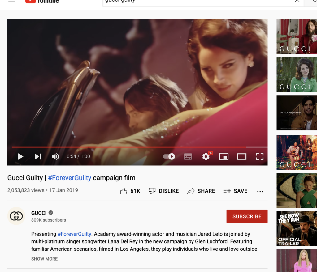 One example of a social media advert is Gucci guilty. This advert shows Jared Leto and Lana Del Ray and the advert has a very 60’s feeling. It shows film cameras, old diners and vintage cars. The video gives a nostalgic feeling, and shows very retro film shots. They are both wearing expensive clothes (Gucci) and very expensive jewellery.