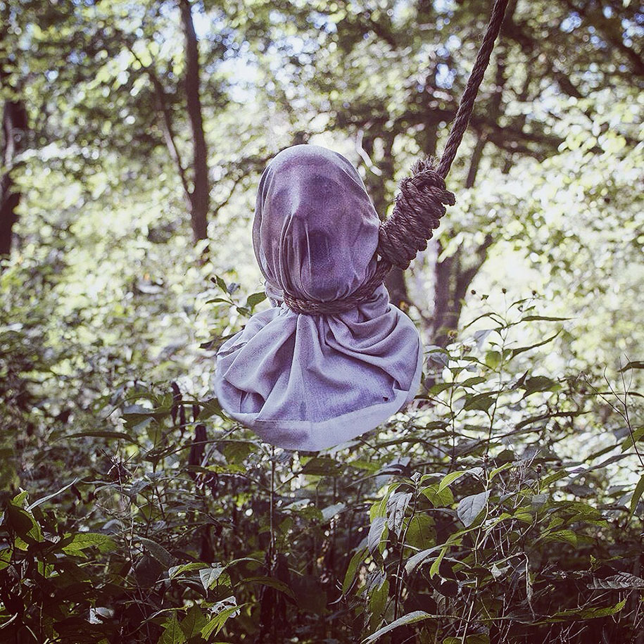 In these images, it looks like the artist has photographed someone standing underneath a piece of fabric in a wooded area, removed them, and then taken the same picture of just the background without the model in the frame; So the two photos can be seamlessly edited together to create a single final image.