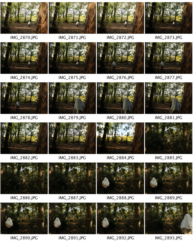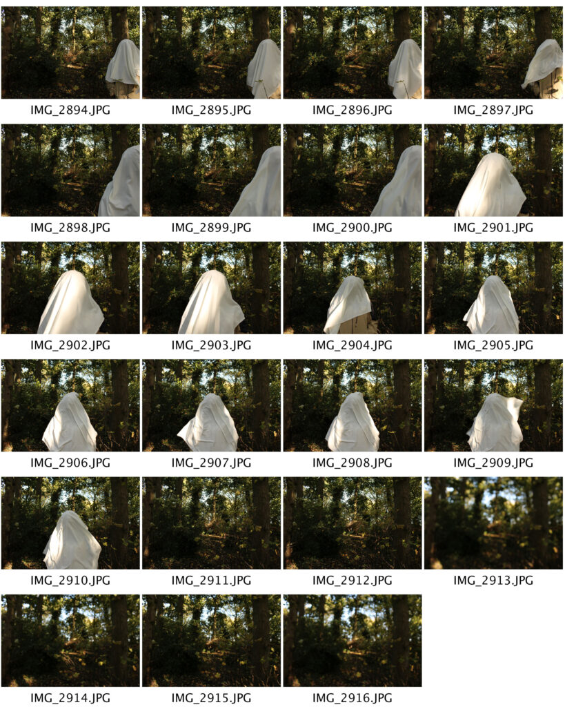 To further mimic the work of Christopher McKenney, I carried out my second shoot in a wooded area. I used a tripod again, along with the white piece of material to cover the models head with. I did the same thing I did during the first McKenney-based shoot, where I took photos with the model in the frame, removed the model, and took the photo again.