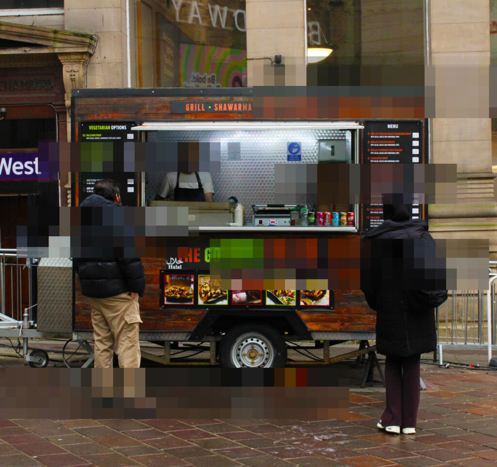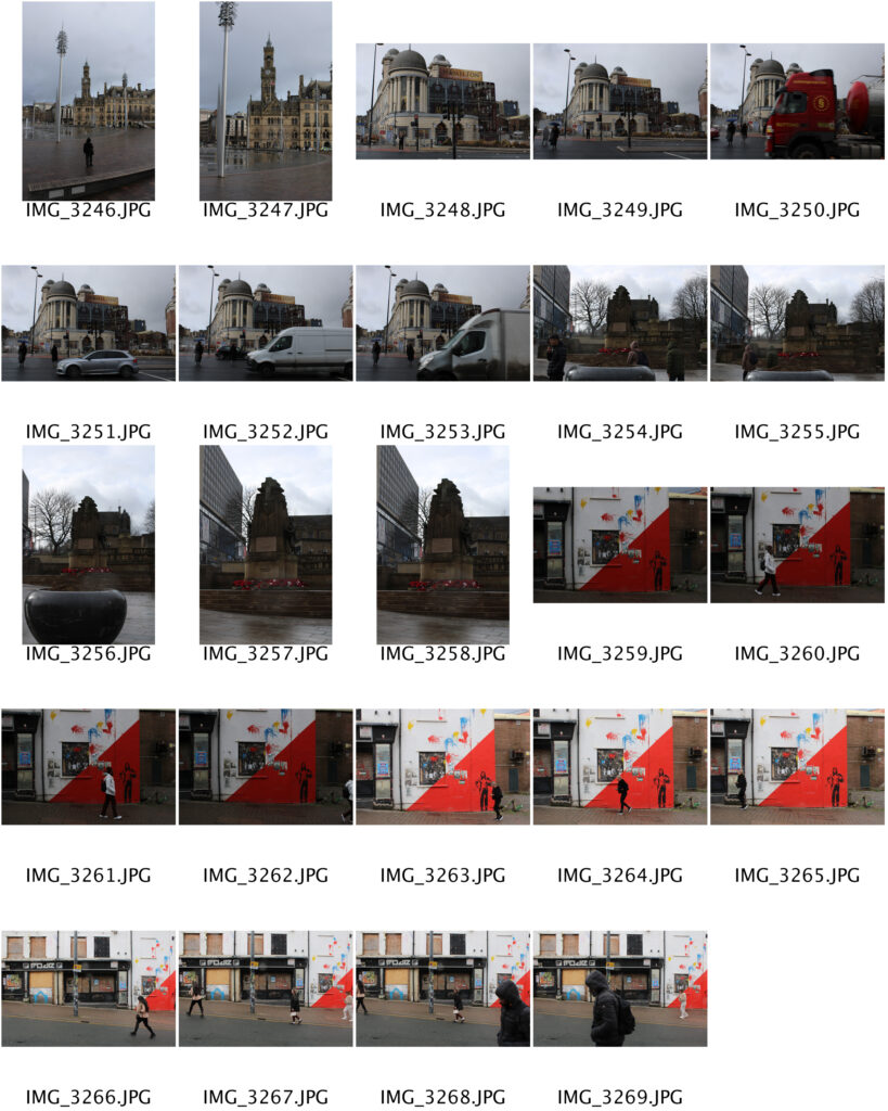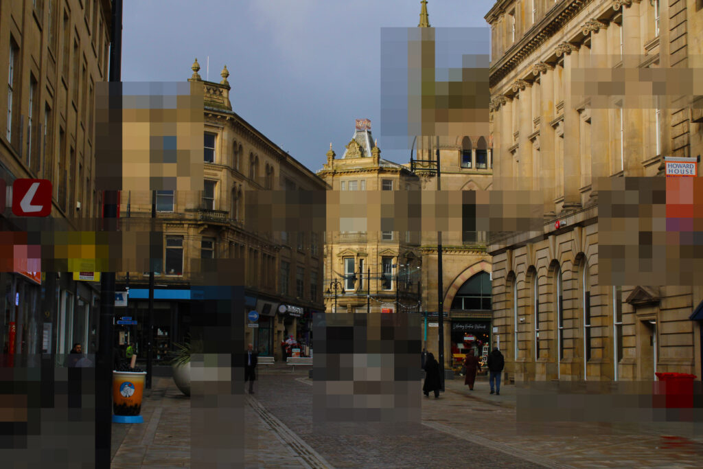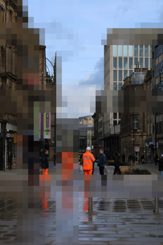 I decided to re-walk the routes in town which I usually take when making my ways to and from college. Many of my photos are wide framed as I felt this would make it easier to pick out certain areas of the scene which I will pixelate in photoshop. I also made sure to take some photos which have subjects with bright colours that are more distinguishable from the background- like the men wearing high-vis clothing- so the viewer can still make out what is blurred, even though they can’t actually see it in detail.