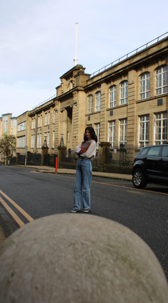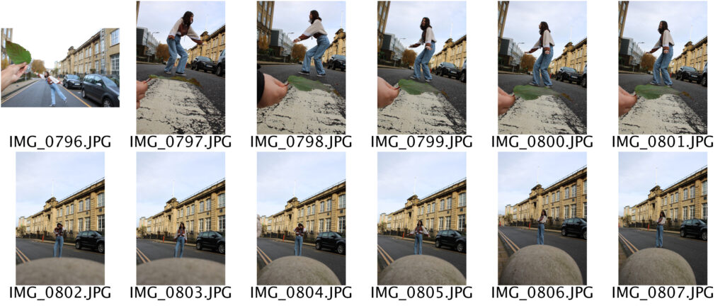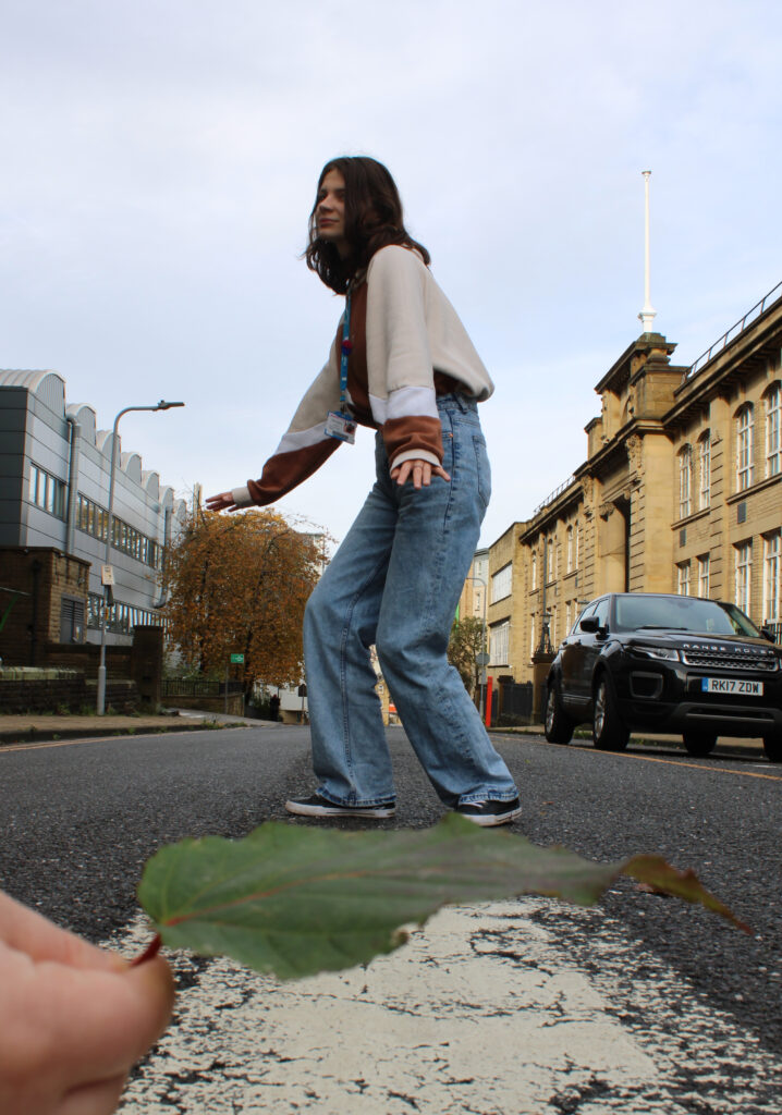 For this picture I used one of the concrete bollards at the side of the street and tried to make it look like she was a smaller person standing on top of it. Again, it was difficult to get the correct angle even though I was crouching down so from afar it looks like she is stood on it but when looking closer, her feet aren’t touching the bollard completely. I think if I tried this again, I would be more mindful of the angle or use a tripod which would make taking the picture and keeping the camera in the correct position a lot easier.