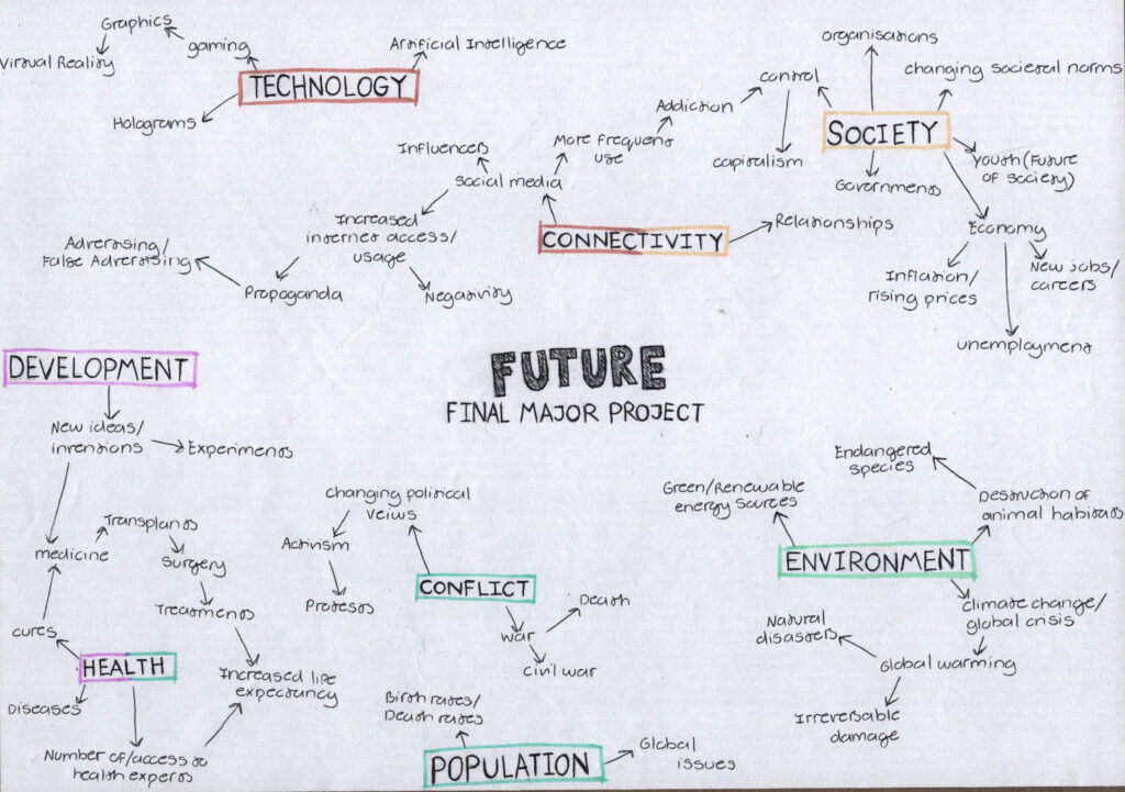 In groups, we made a Lotus Blossom mind-map of ideas and topics that link to the theme of the Future. I then went on to making my own personal mind-map full of the most interesting ideas from the group work and of my own. This was so I could try to get a better idea of what I wanted my main concept for this project to be.